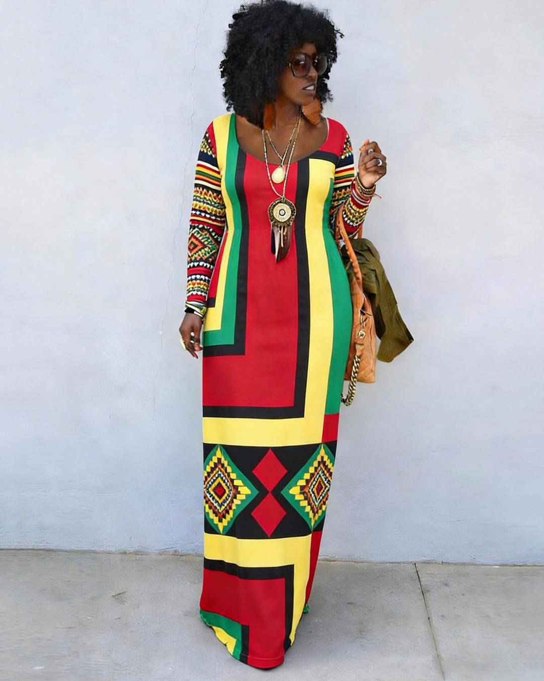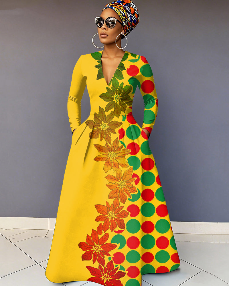 V-Neck Reggae-colored African Prints Long-Sleeved Pocket Maxi Dress