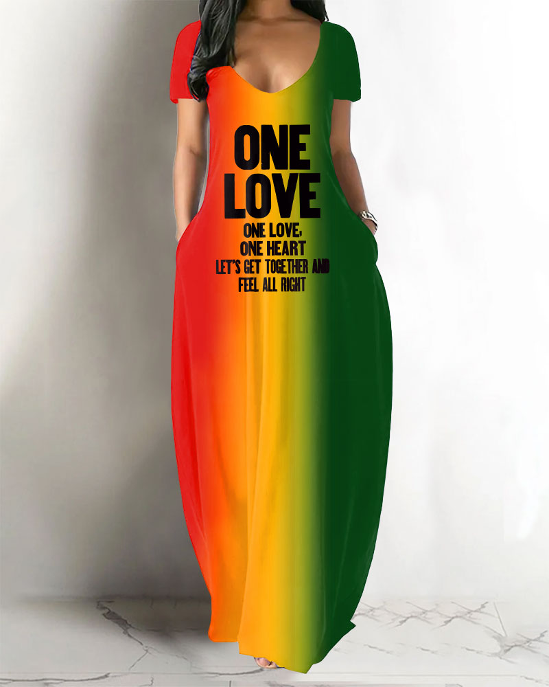 V Neck Reggae Print Short Sleeve Pocket Maxi Dress