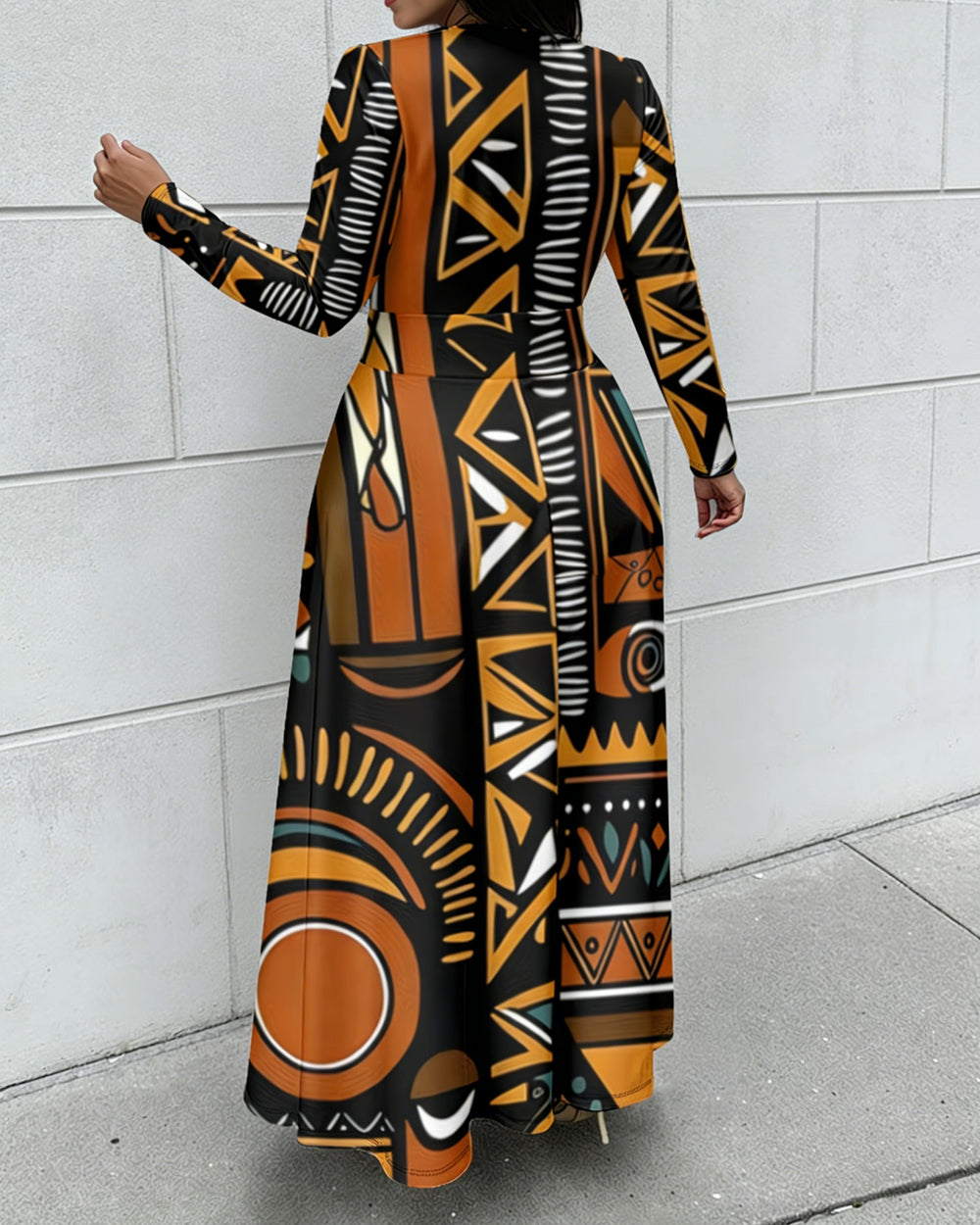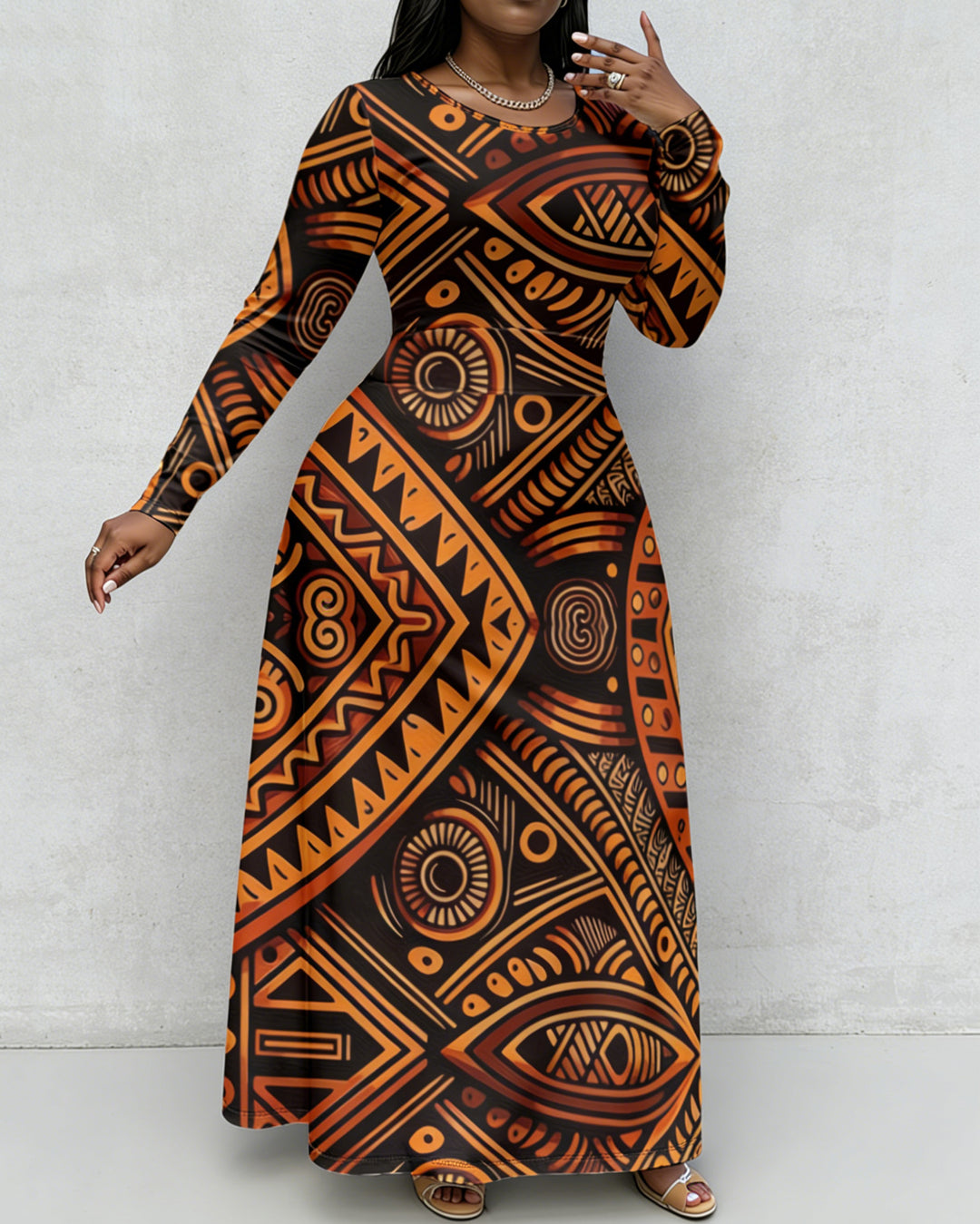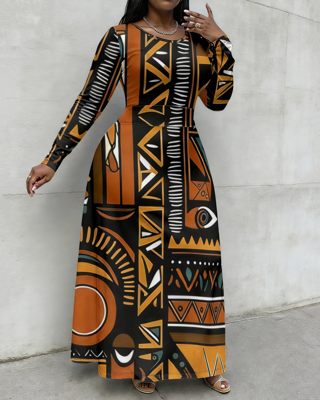 Reggae Tribal Print Crew Neck Long Sleeve Dress
