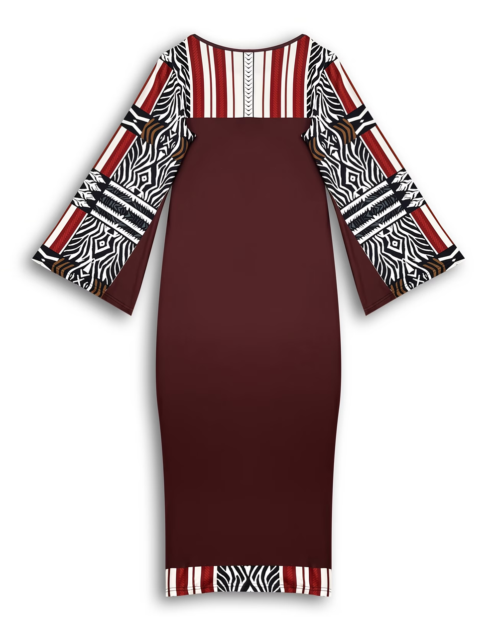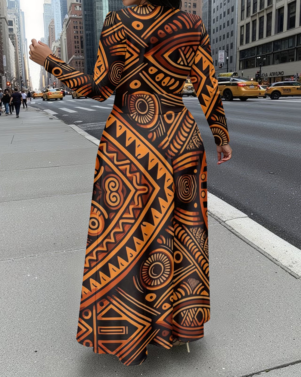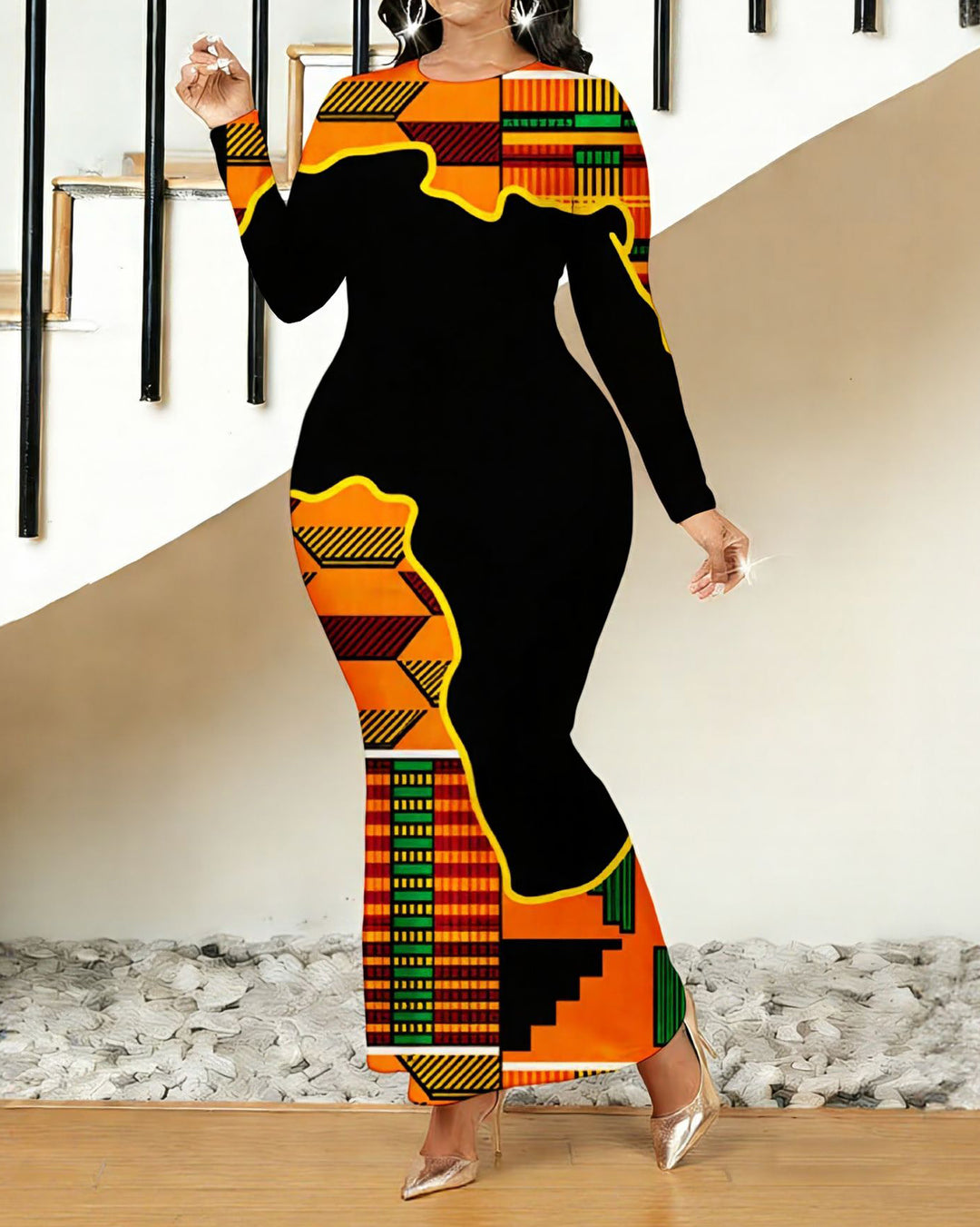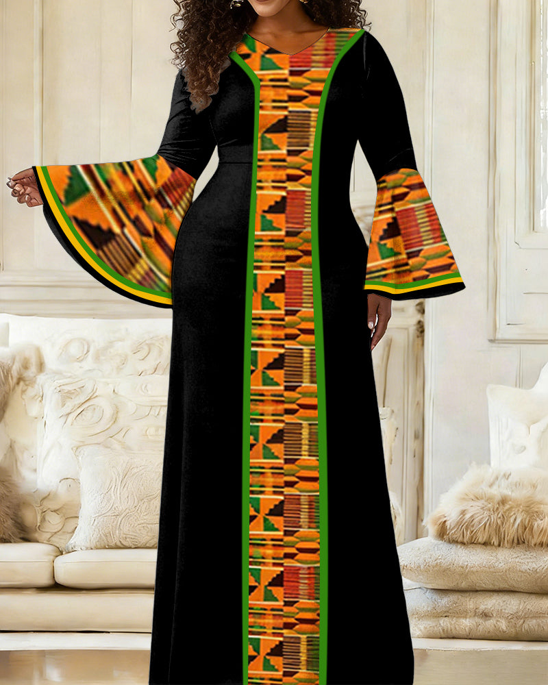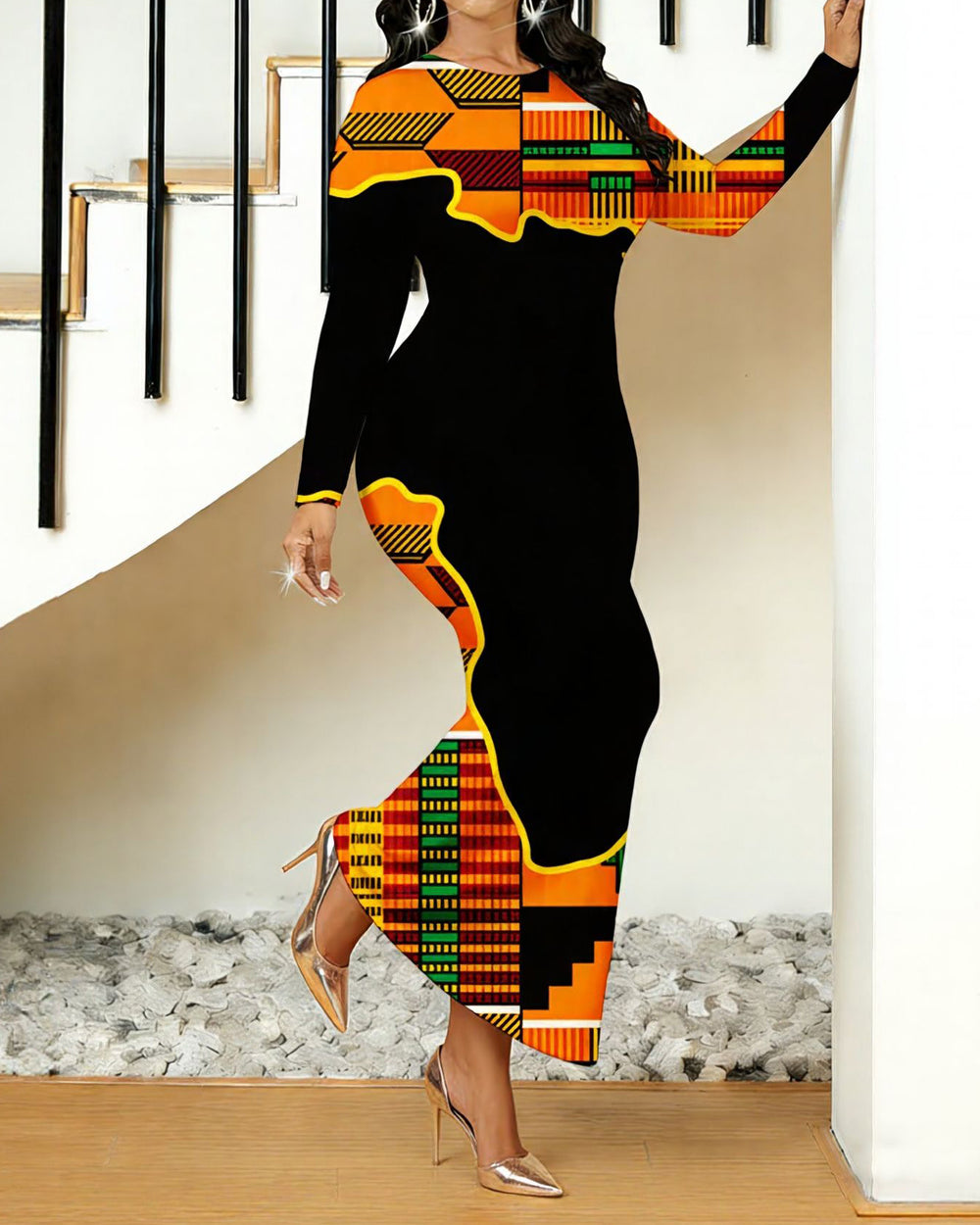 Geometric Totem Splicing Round Neck Bell Sleeve Bodycon Long Dress
