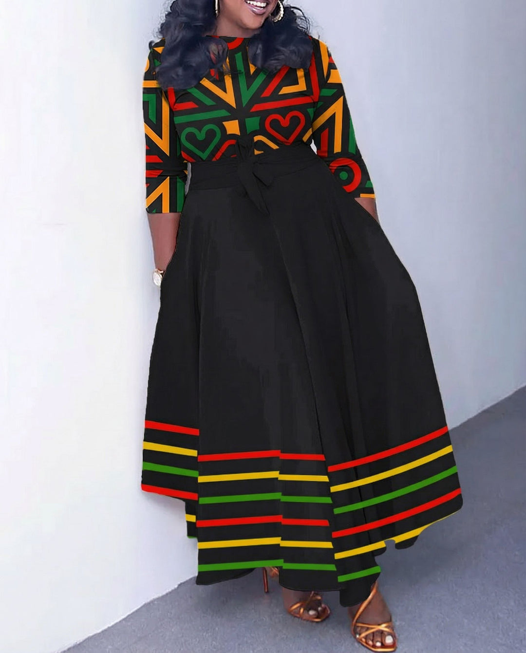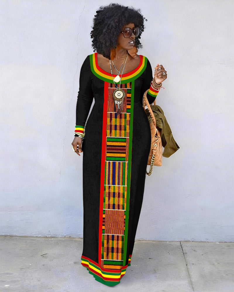 Reggae Stripe Patchwork African Print Print Crew Neck Long Sleeve Dress