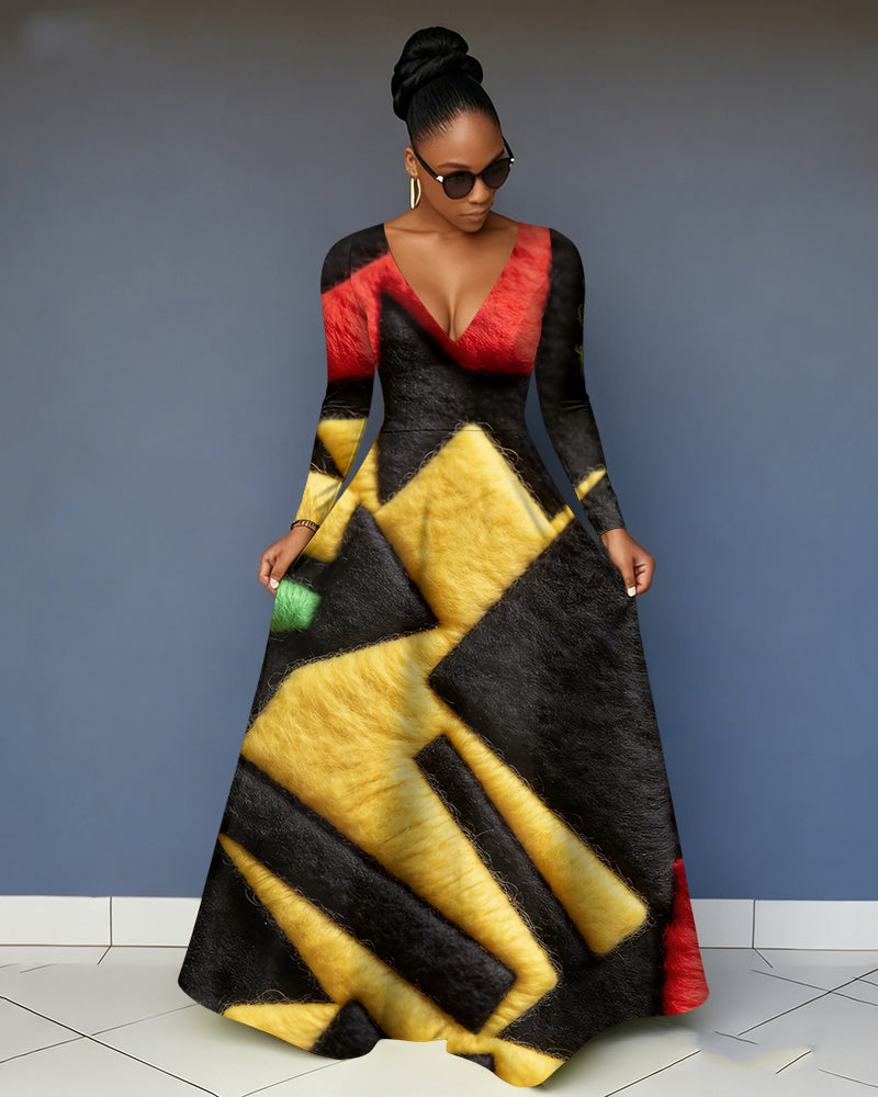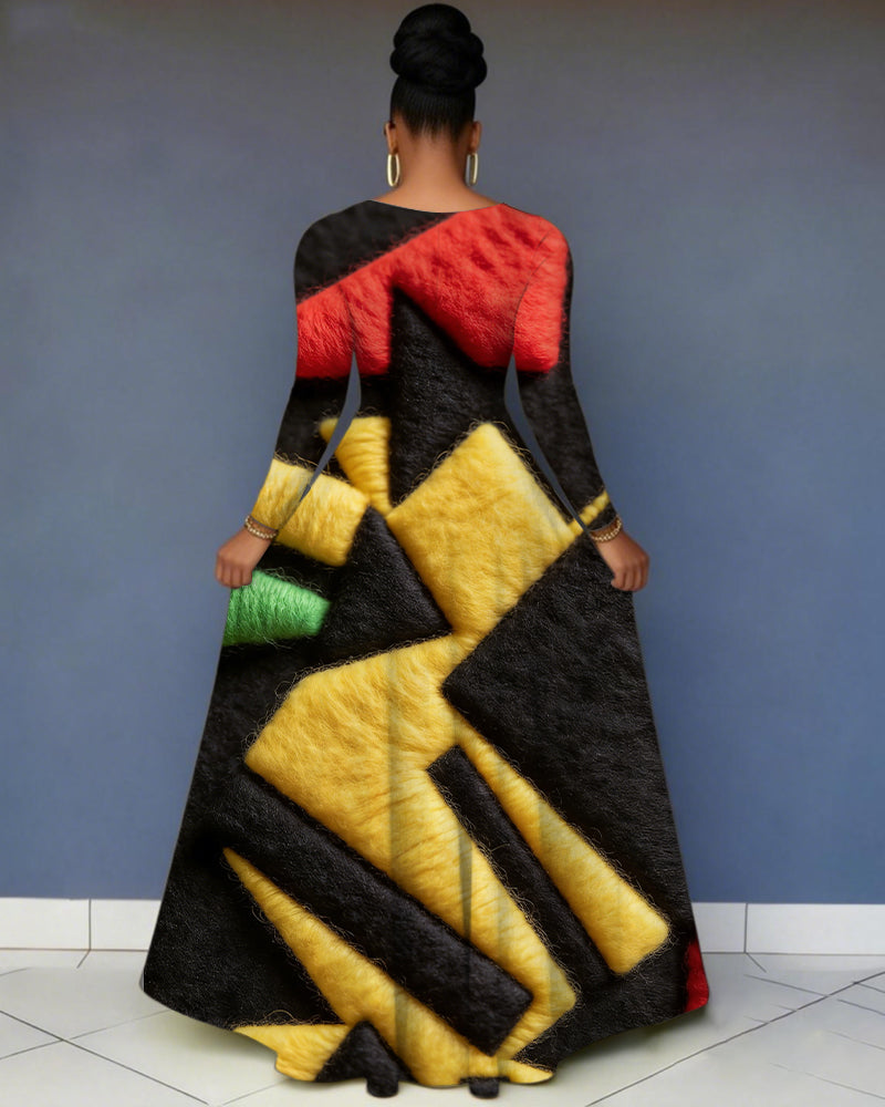 V-Neck Geometric Color Blocking Pocket Long-Sleeved Maxi Dress
