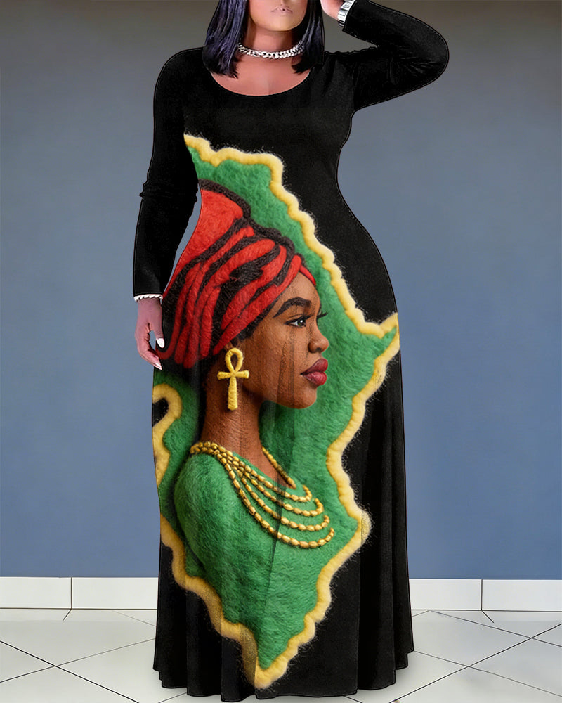 Round Neck African Women's Art Print Pocket Maxi Dress