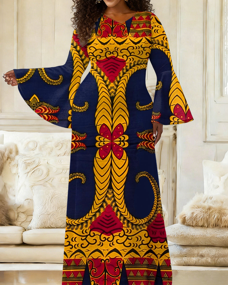 Women's African Geometric Print Elegant Bell-Sleeve Slim-Fit Dress