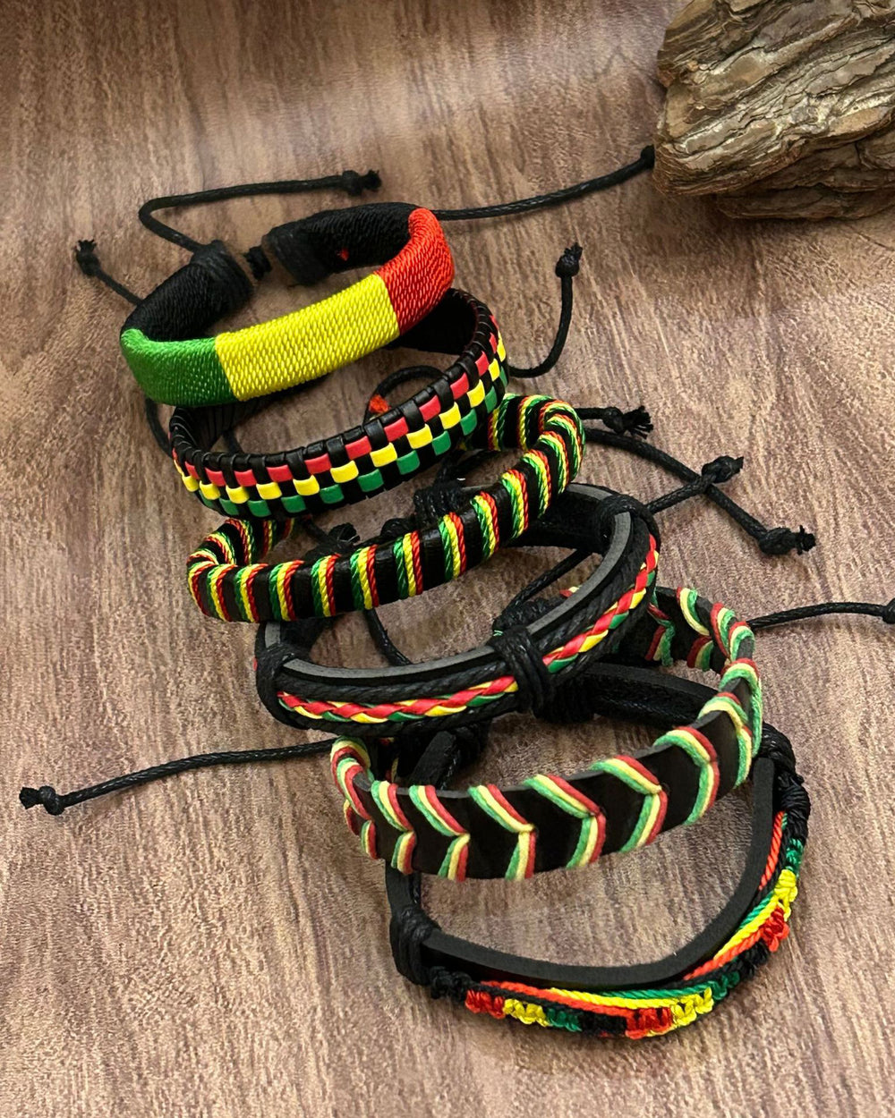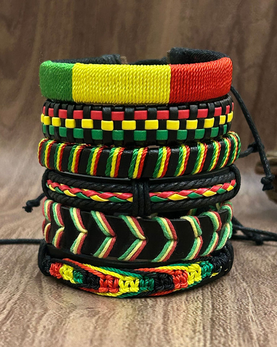 6-Piece Reggae-Inspired Colorful Leather & Cord Braided Adjustable Bangles Set