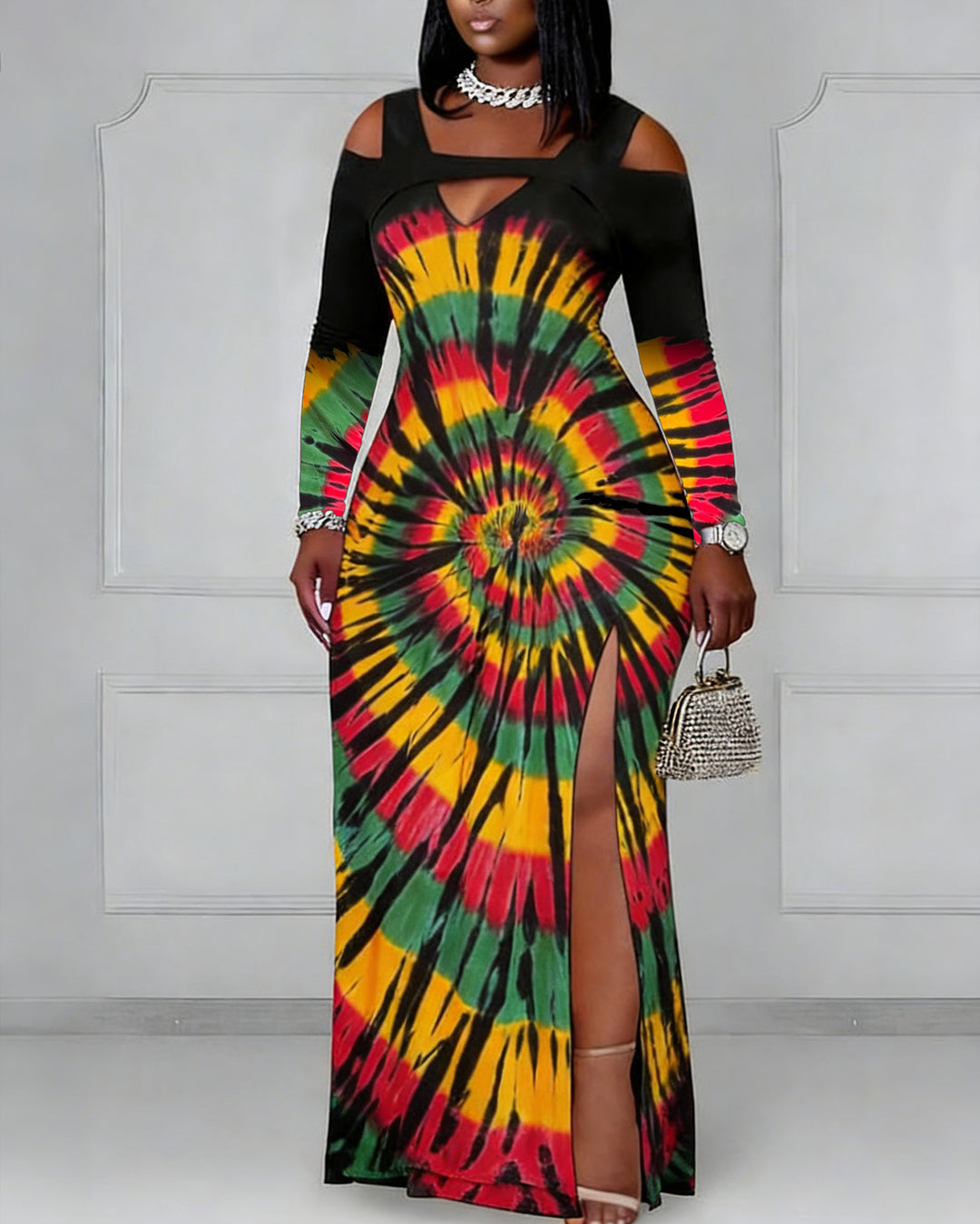 Cutout Off-shoulder V-neck Reggae Tie-dye Color Blocking Long Sleeve Bodycon Party Dress