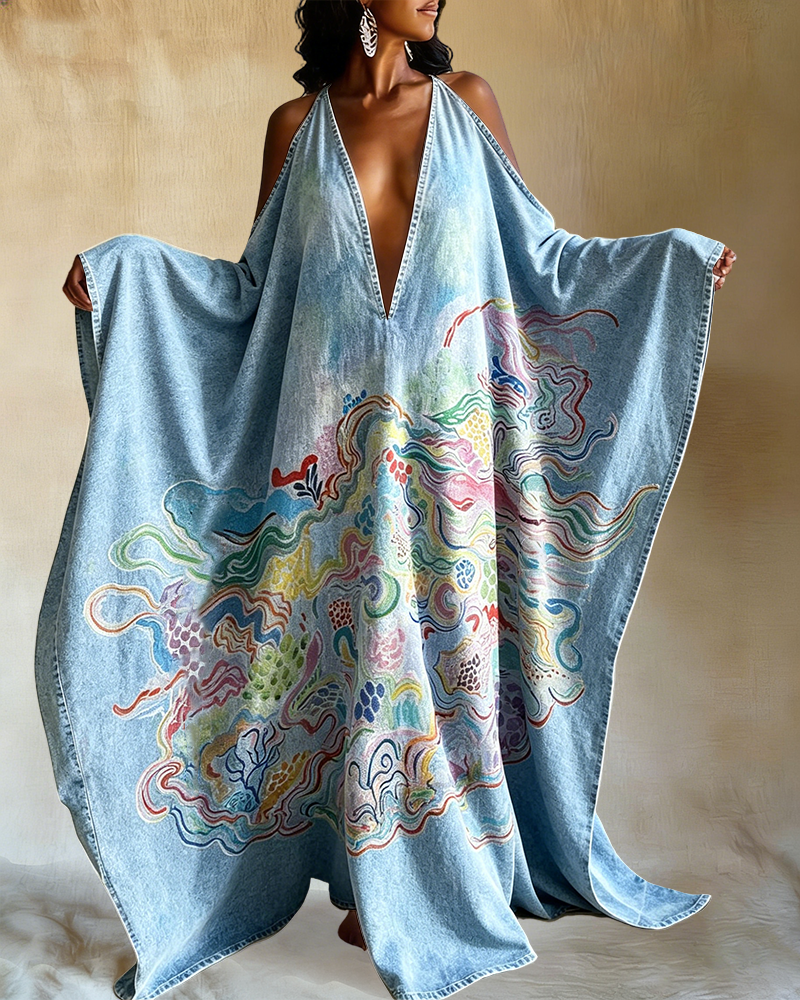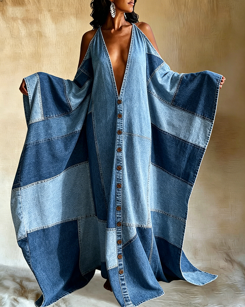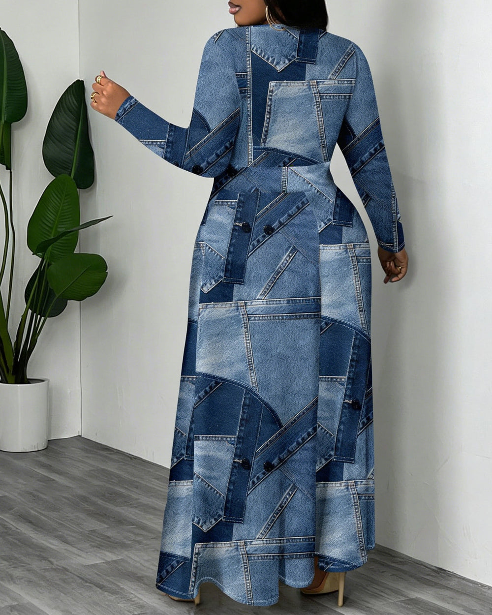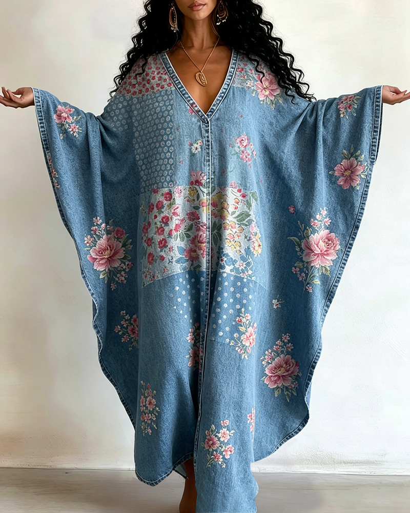 Denim Patchwork Print Patchwork V-neck Long Kaftan Dress