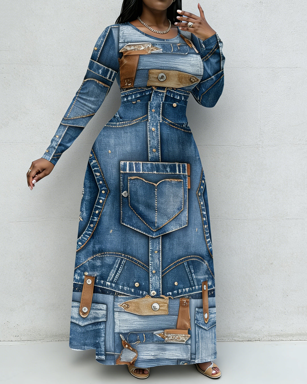 Fun Denim Pocket Patch Print Crewneck Long Sleeve Pocket Dress