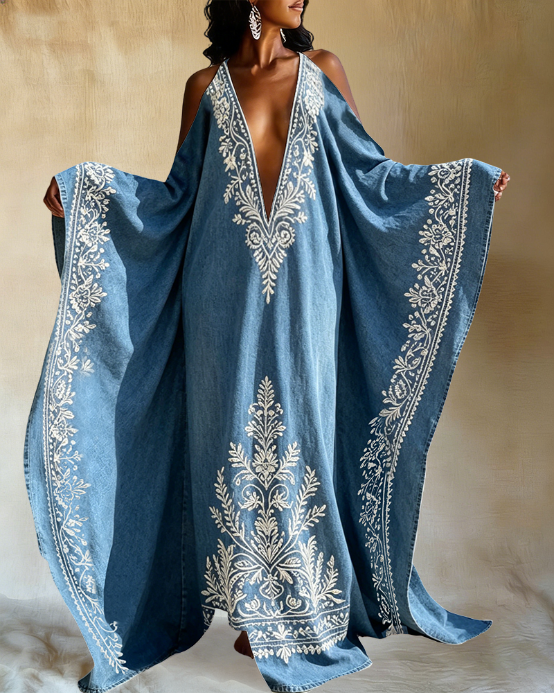 Classic Denim Print Patchwork V-neck Long Kaftan Dress