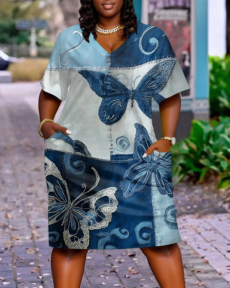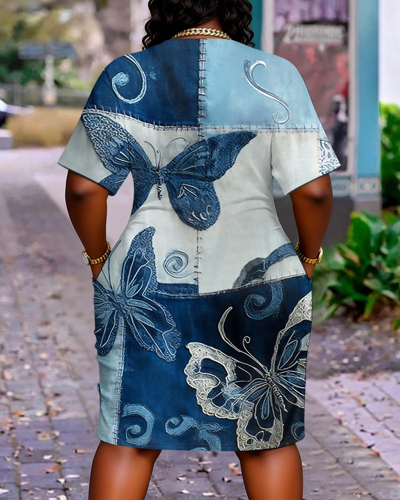 Multicolor Denim Patch Butterfly Print Pocket Casual Dress
