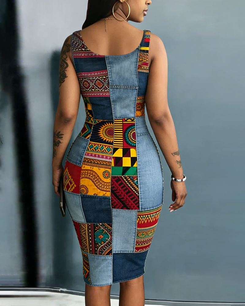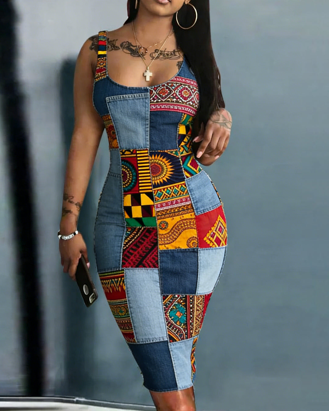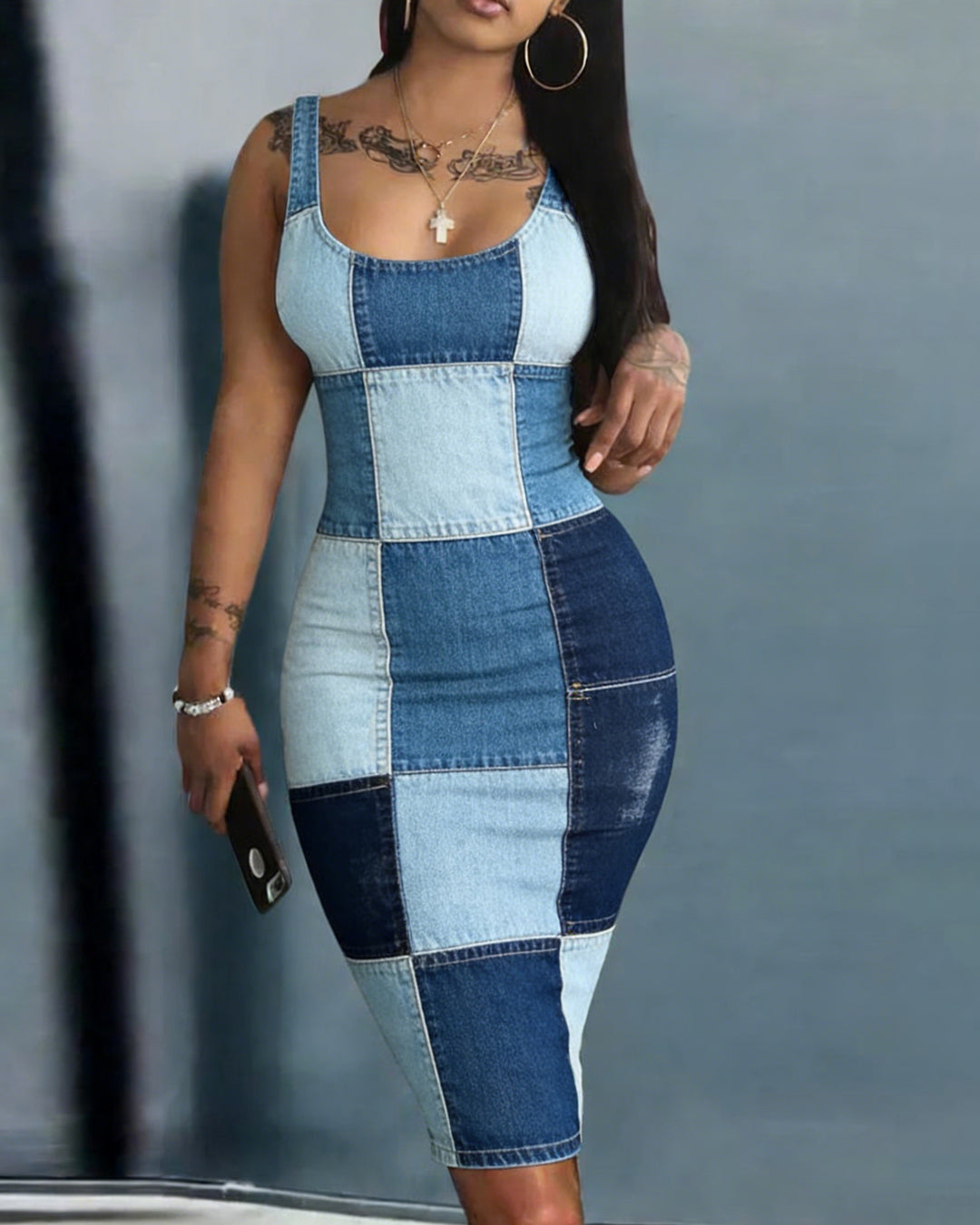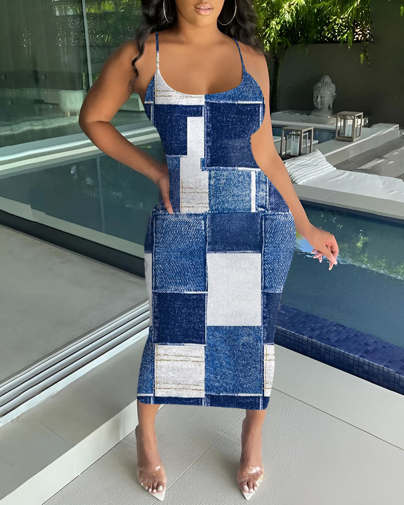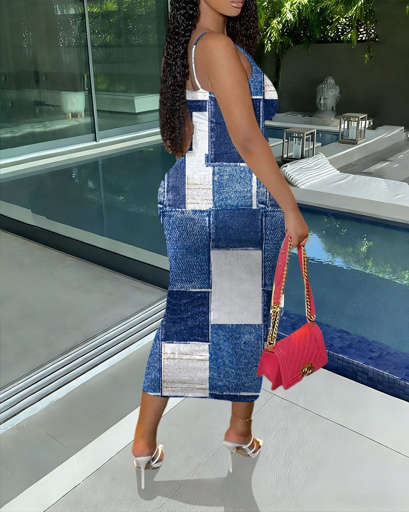 Vintage Color Block Denim Patch Print Full-Width Bodycon Camisole Midi Dress