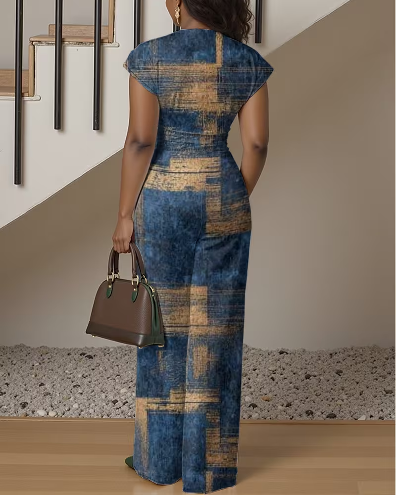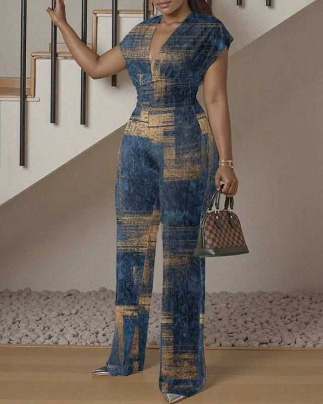 2D Flat Pattern Digital Printing V-Neck Waist Straight Jumpsuit