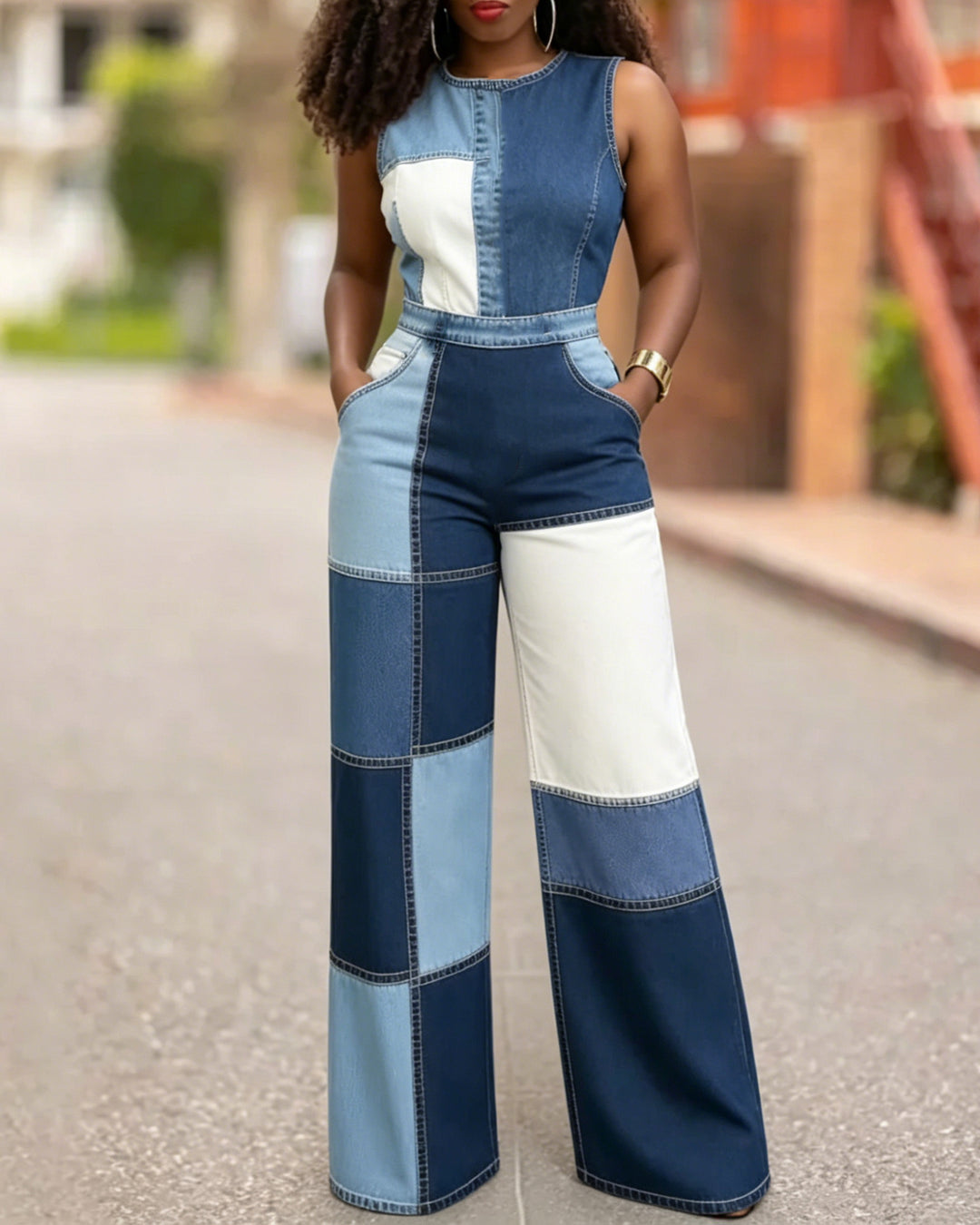 Color-blocked Denim Patches V-Neck Waist Straight Jumpsuit