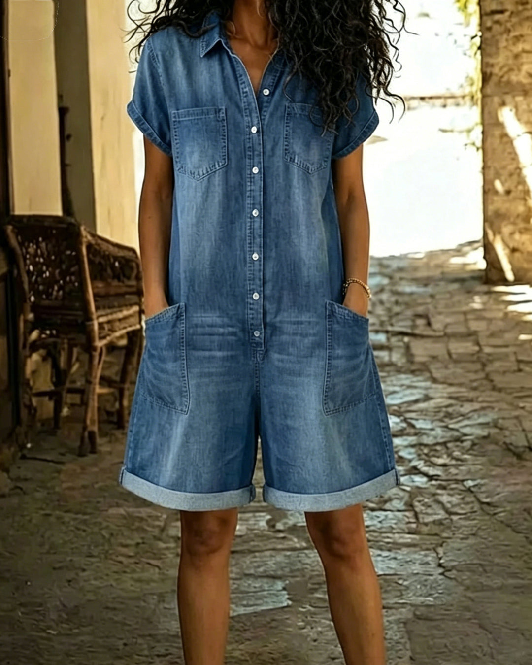 Women's Casual Washed Denim Jumpsuit with Pocket Shorts