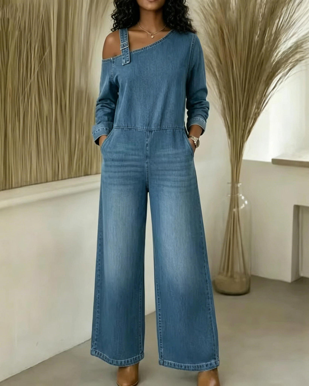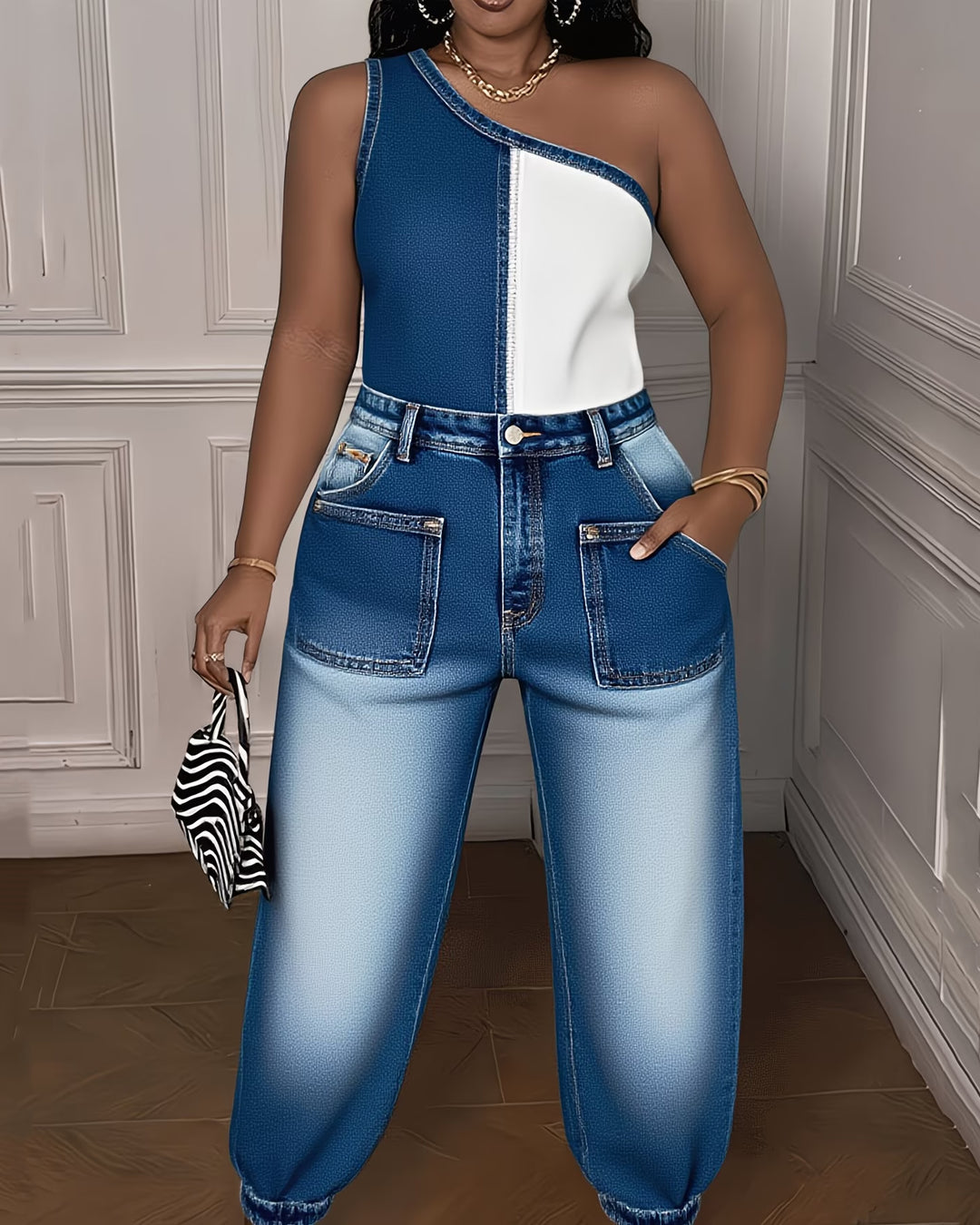 Denim Patchwork Print One-shoulder Jumpsuit- Not Faux Denim Fabric