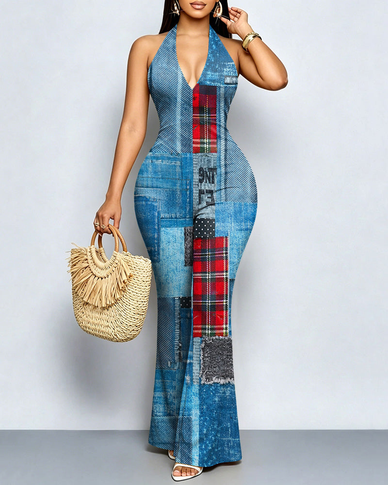 V Neck Fun Denim Patchwork Print Sleeveless Pocket Maxi Dress