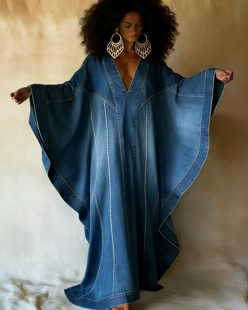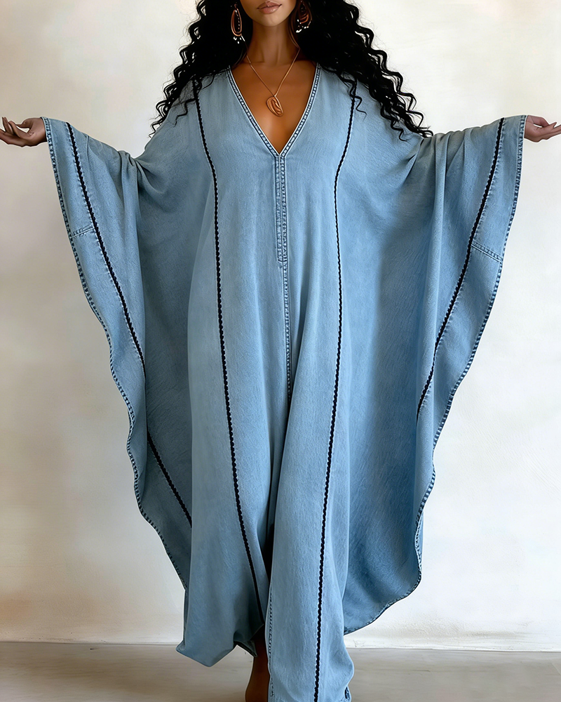 Washed Denim Texture Print V-neck Long Kaftan Dress