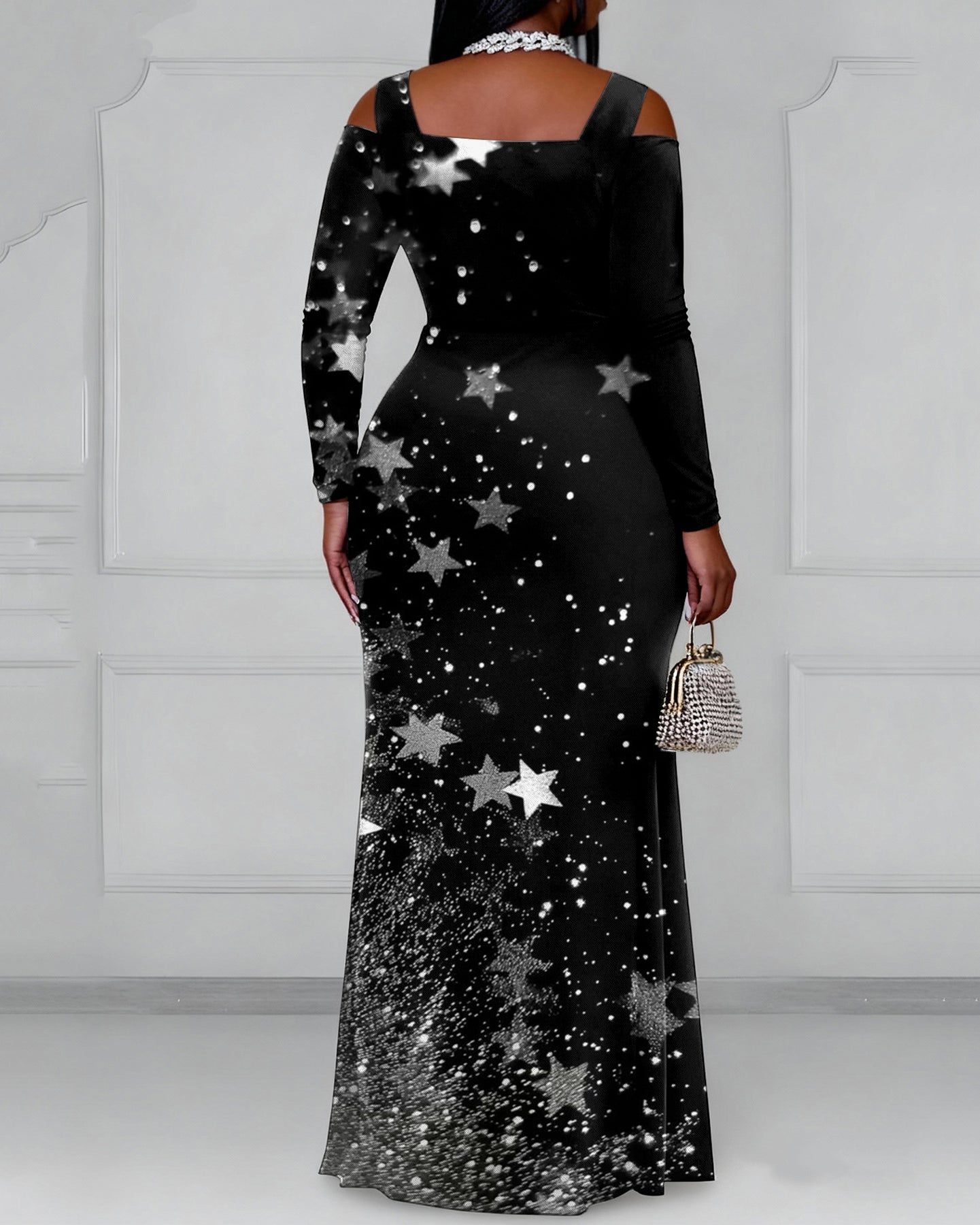 Cutout Off-shoulder V-neck Silver Star Long Sleeve Bodycon Party Dress