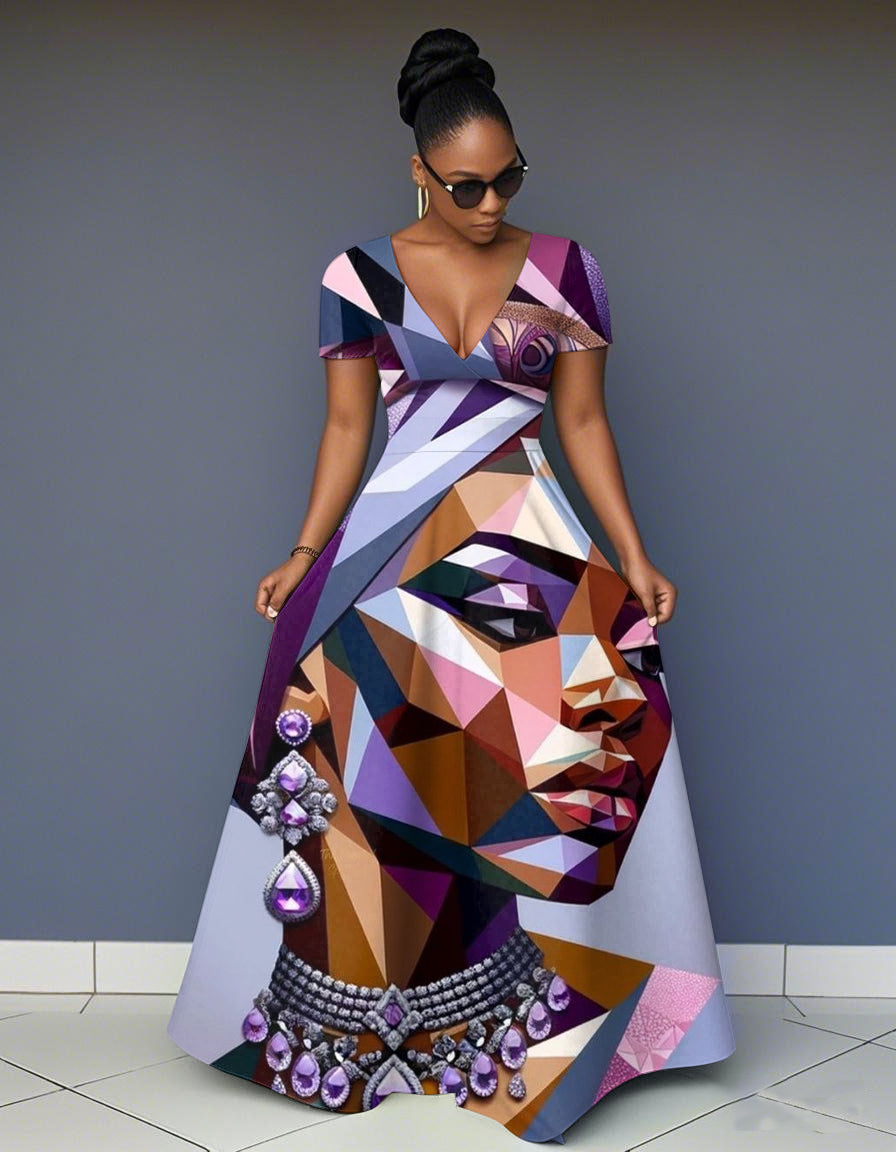 V Neck Abstraction of Black Woman Short Sleeve Maxi Dress
