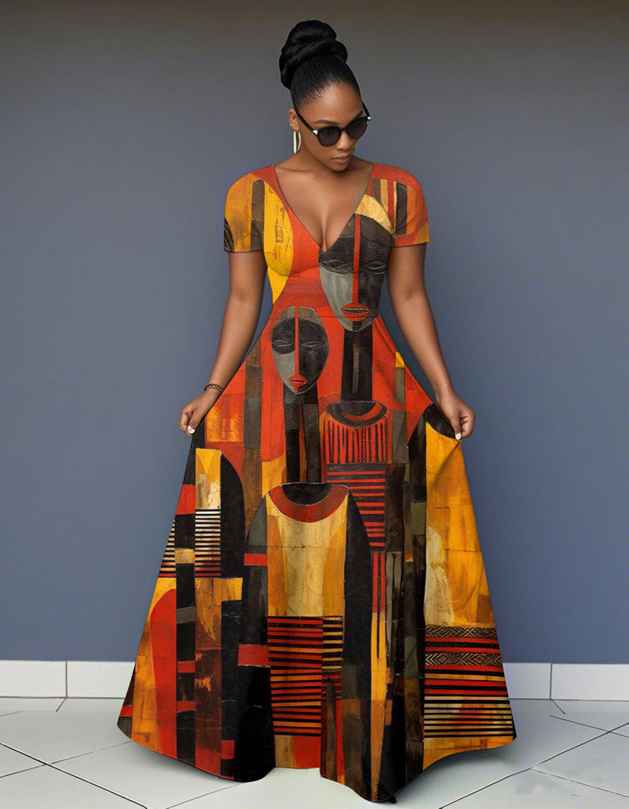 V Neck African Abstract Wall Art Short Sleeve Maxi Dress