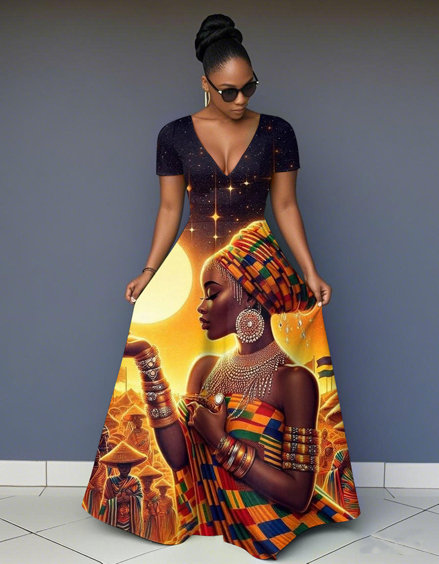 V Neck African Oil Painting Woman Short Sleeve Maxi Dress