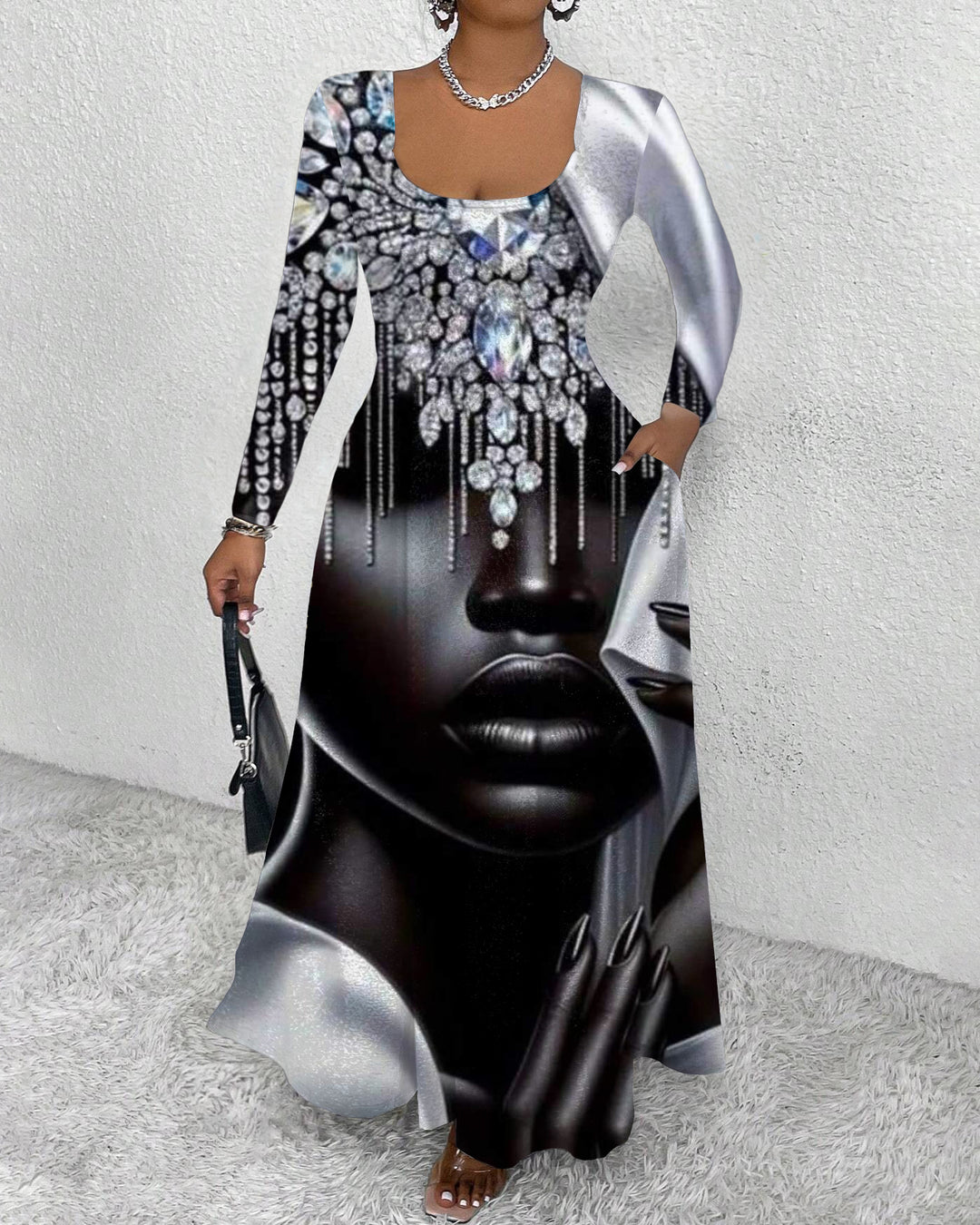 U-neck Diamond Black Girl Art Pocket Long Sleeves Maxi Dress