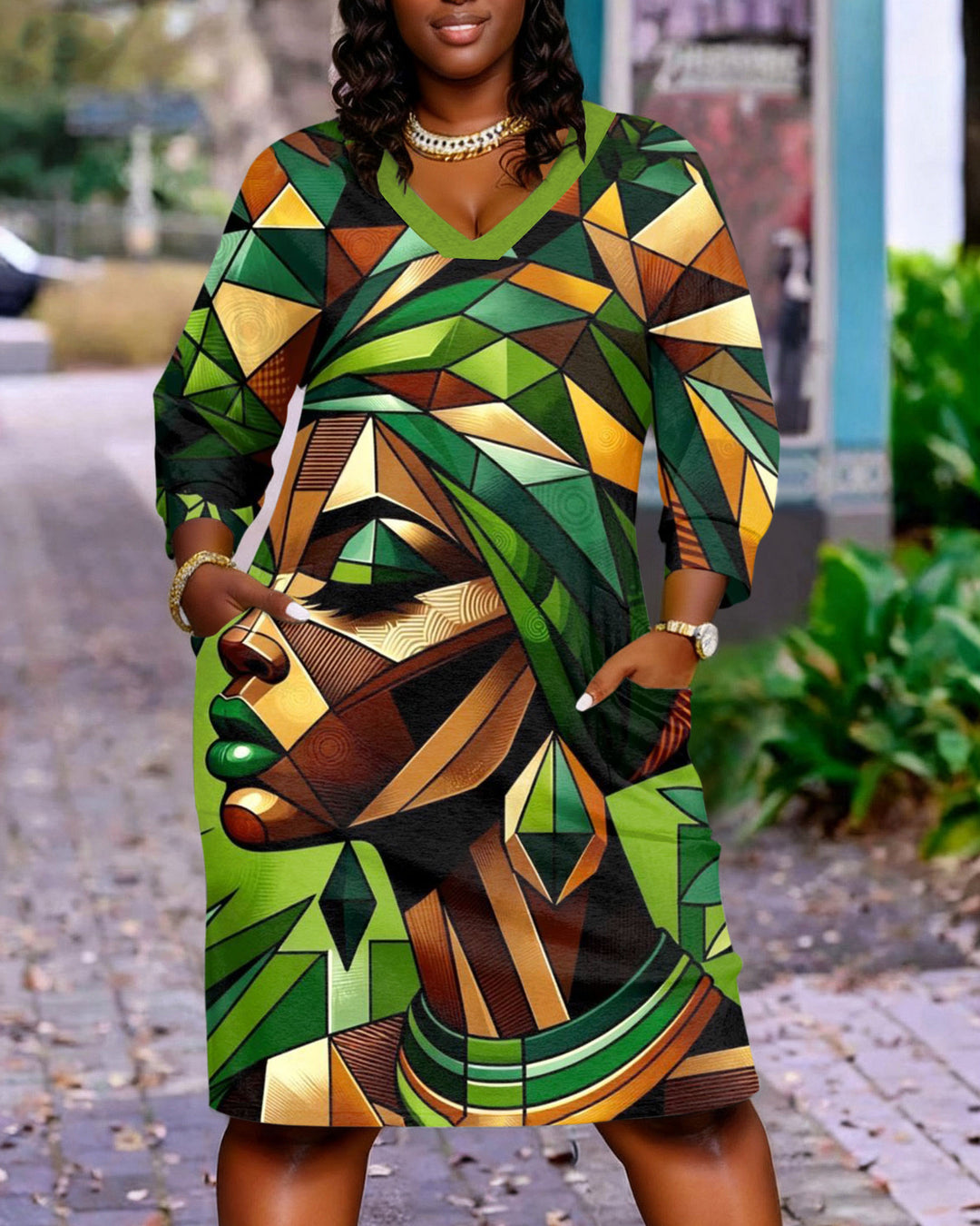 Cubist African Princess Painting Long Sleeve Casual V-neck Pocket Dress