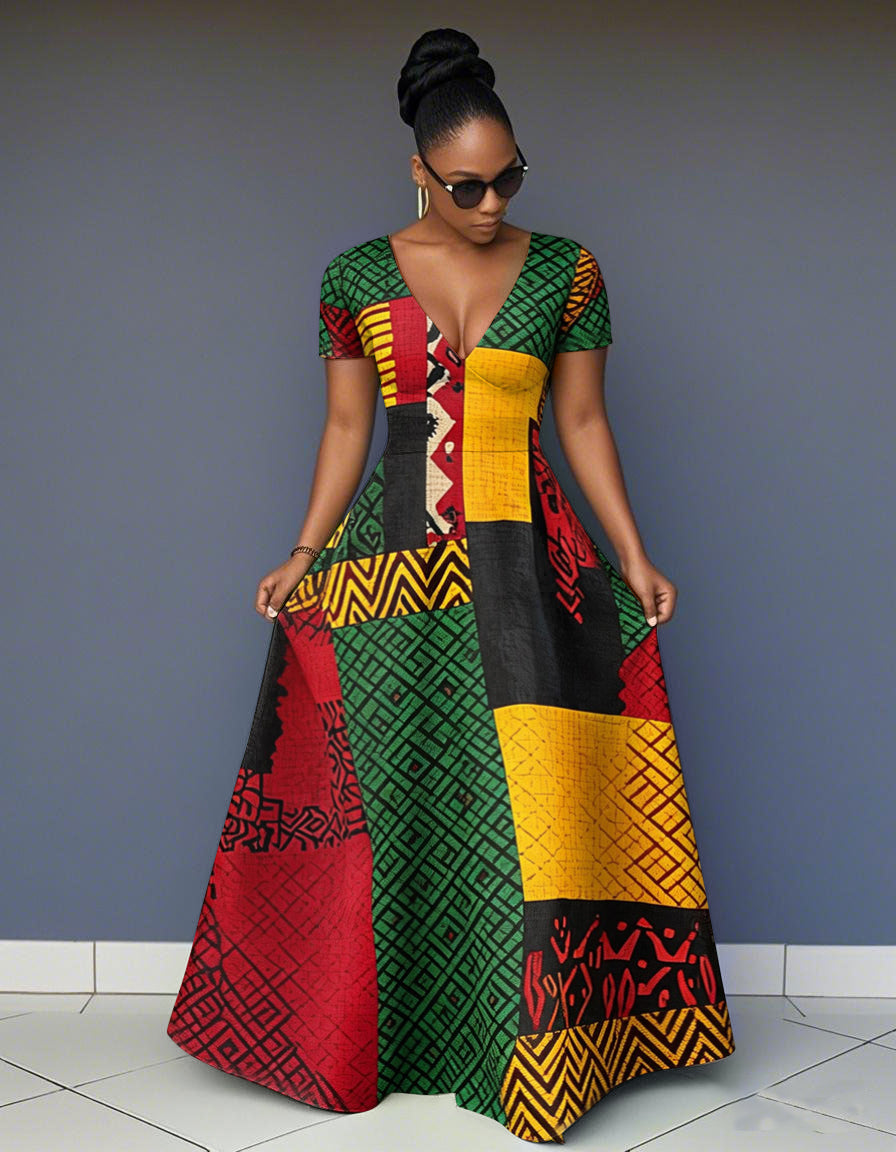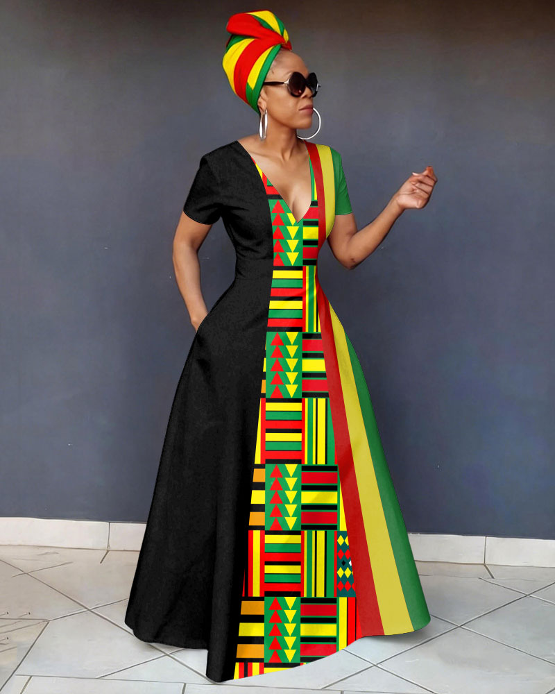 V Neck Reggae Color Blocking African Print Short Sleeve Pocket Maxi Dress