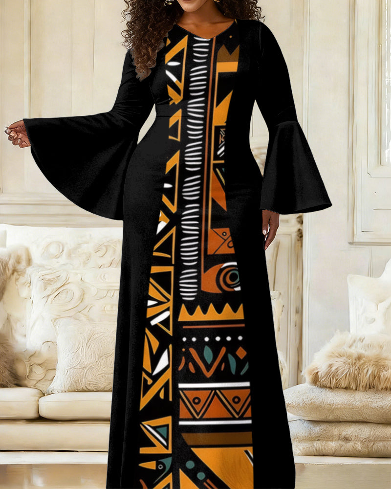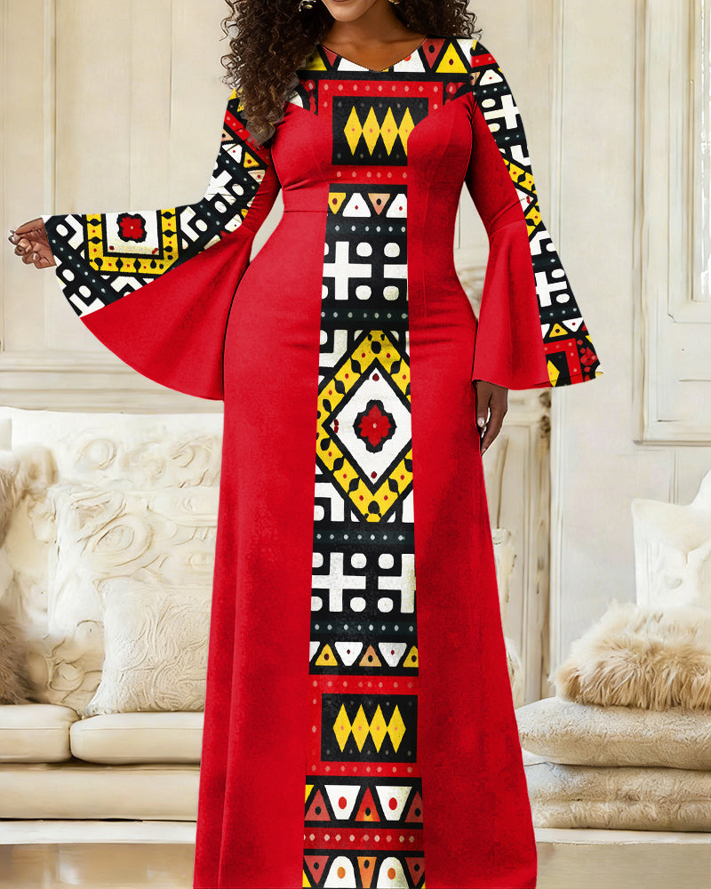 Women'S Elegant Bell-Sleeve Retro Totem Print Patchwork Splicing Fitted Dress