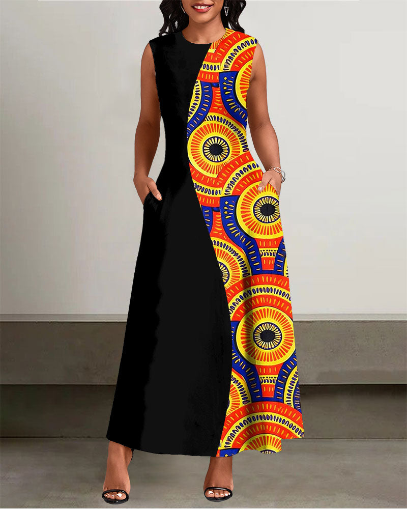 Crew Neck African Polka Dot Print Patchwork Sleeveless Pockets Maxi Dress