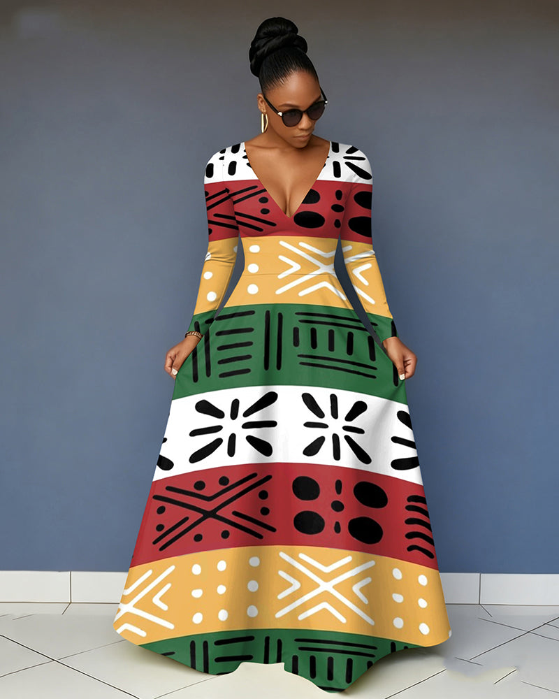 V-neck African Culture Canvas Art Long-Sleeved Maxi Dress