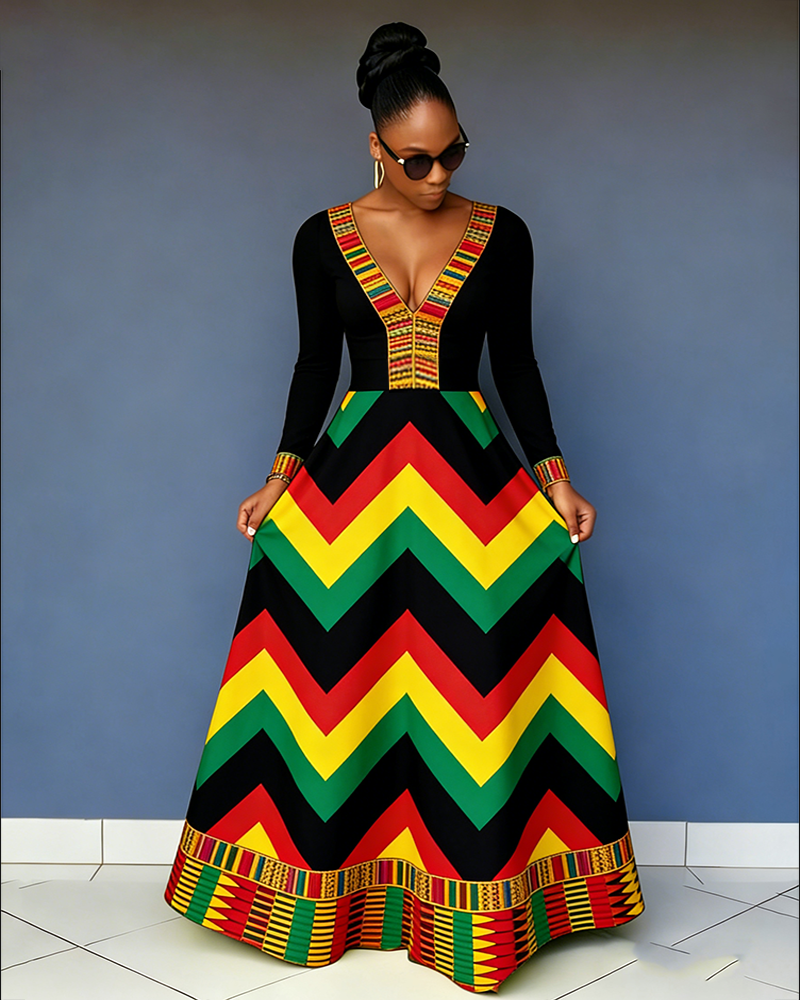 V-Neck Reggae-colored African Prints Long-Sleeved Pocket Maxi Dress