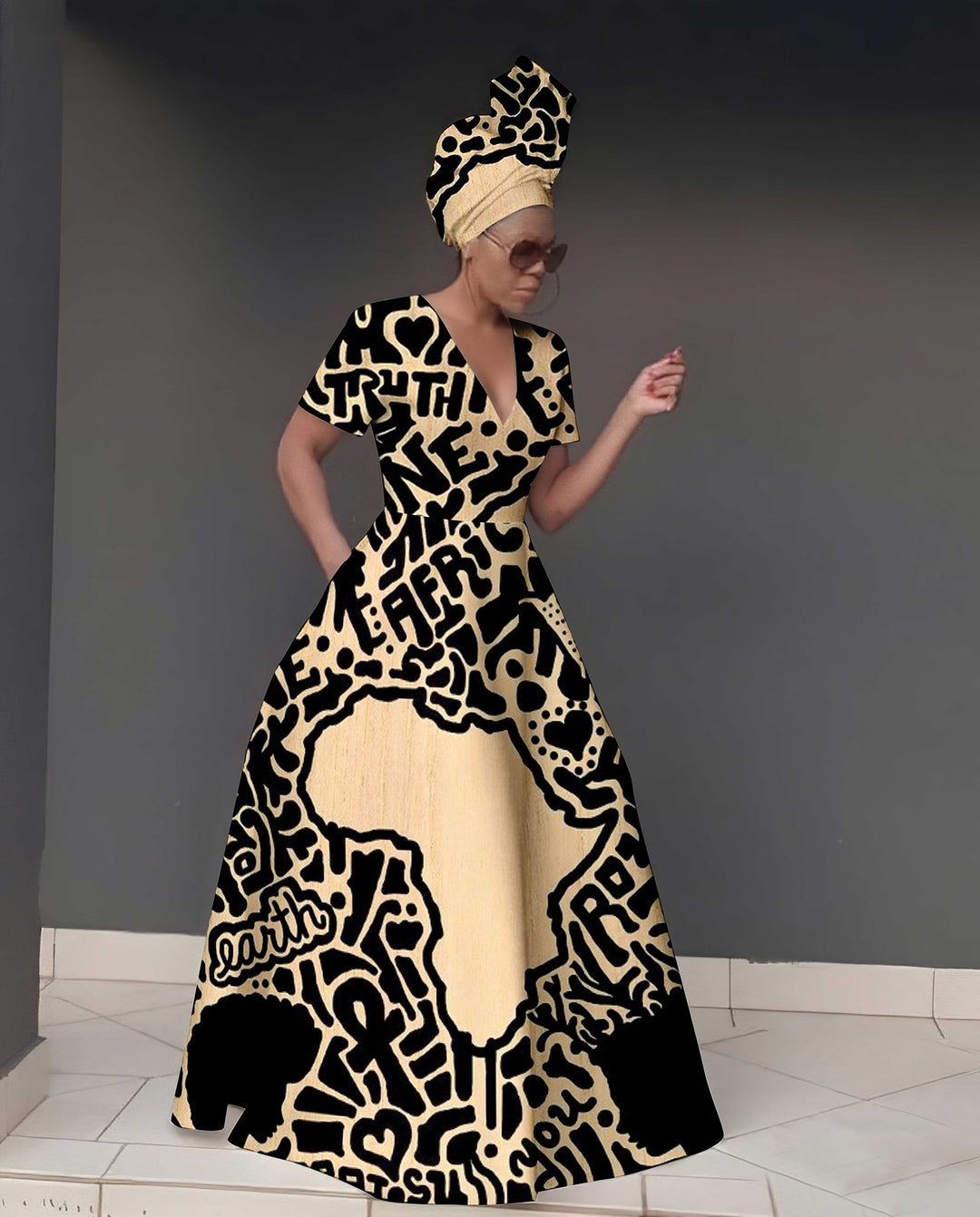 V Neck African spiral print Short Sleeve Maxi Dress