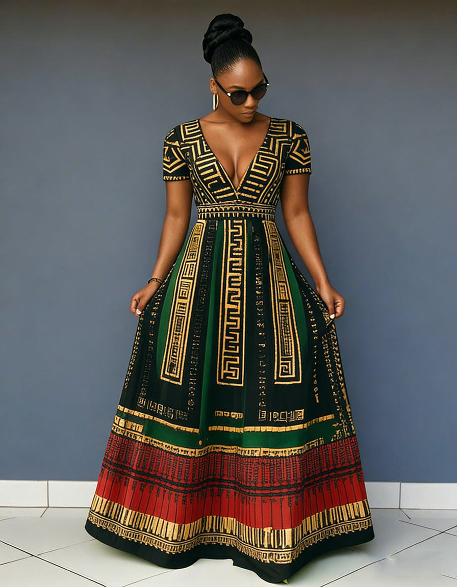 V Neck African Irregular Geometric Texture Short Sleeve Maxi Dress