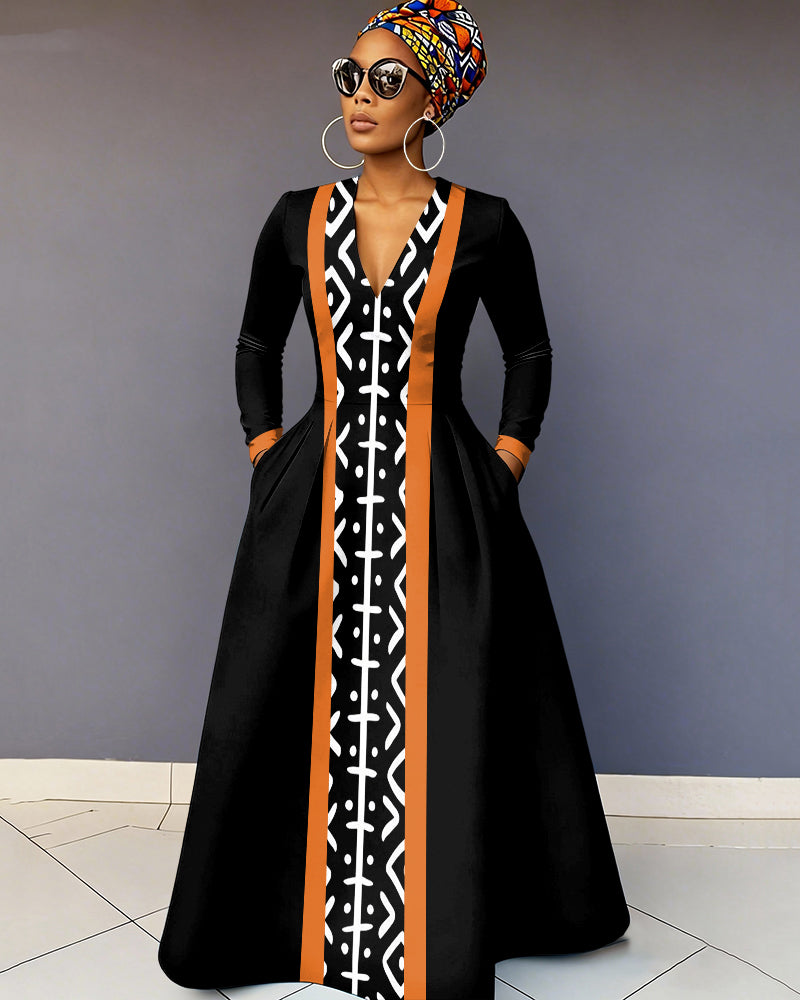 V-Neck Retro African Color Blocking Pocket Long-Sleeved Maxi Dress
