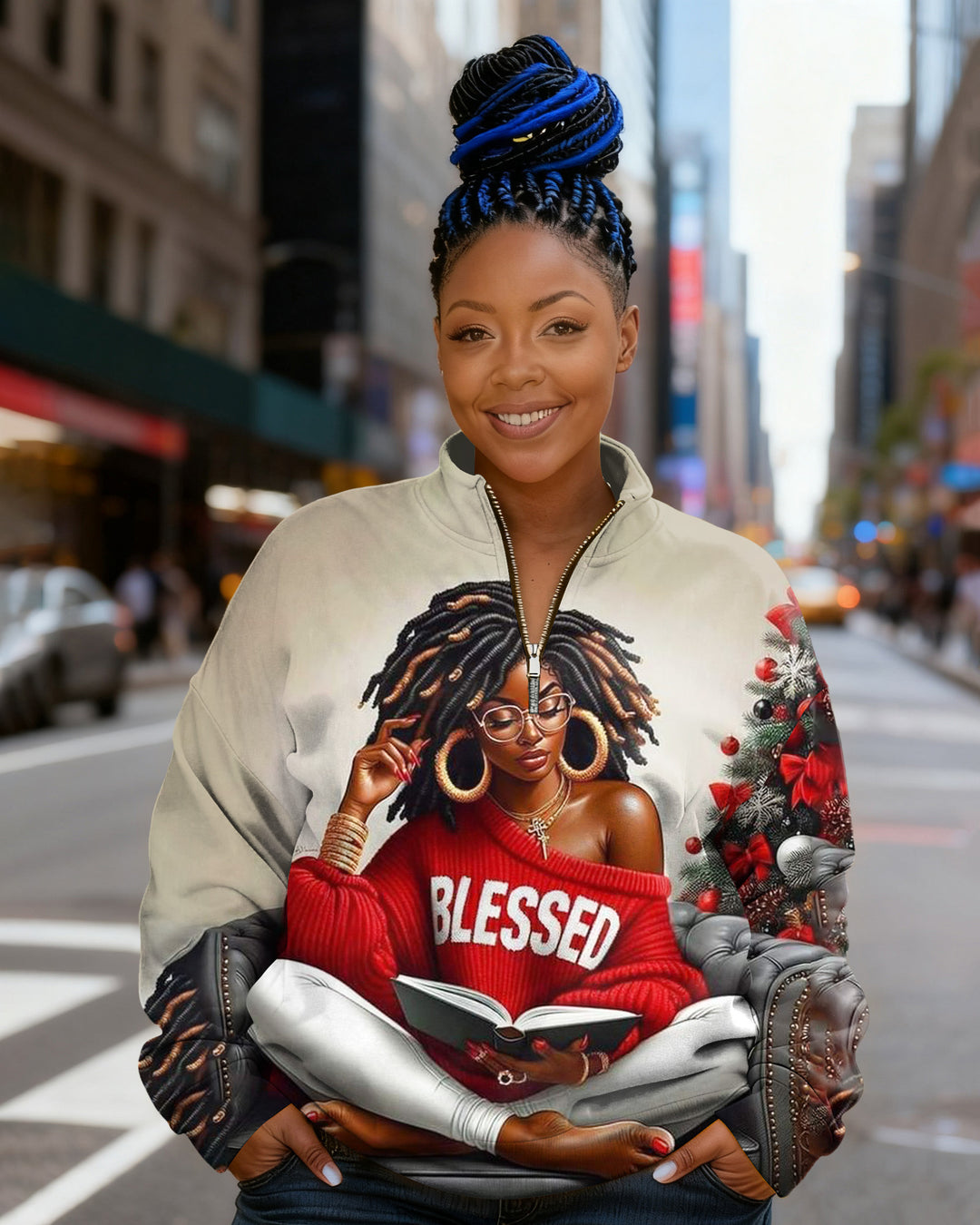 Nubian Melanin Black Girl Stand Collar Zip Up Long Sleeve Sweatshirt