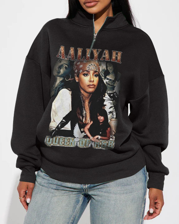 Aaliyah Queen Of R&B Stand Collar Zip Up Long Sleeve Sweatshirt