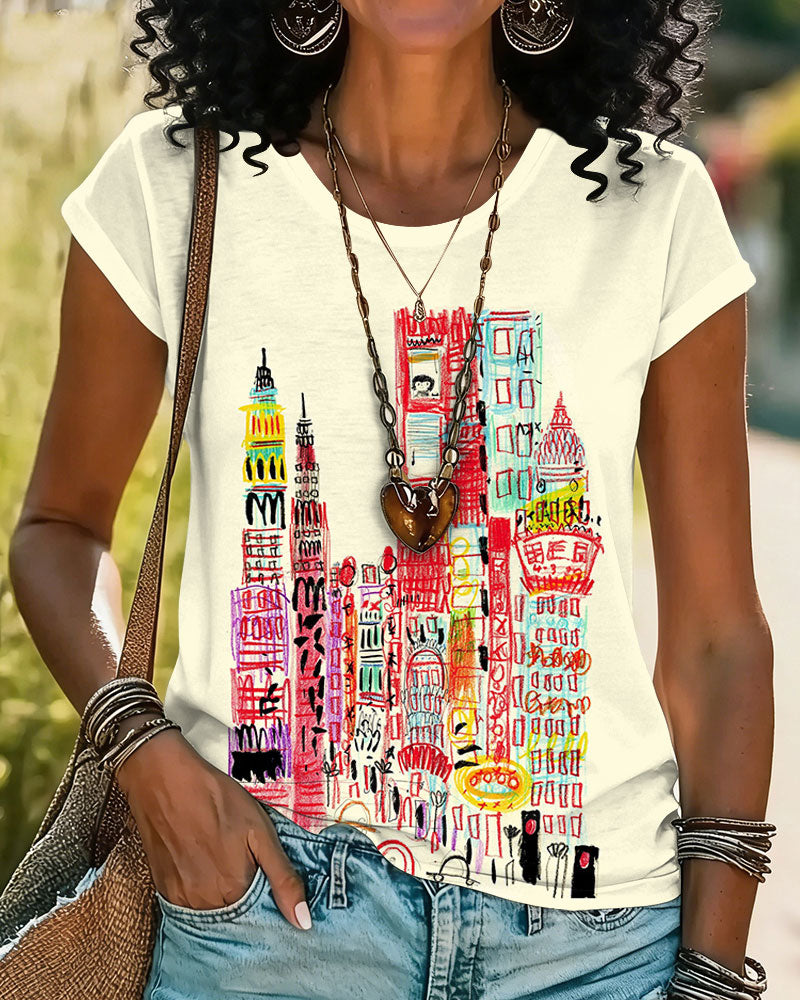 100% Cotton Women's Crewneck Fun Graffiti City Short Sleeve Tshirt