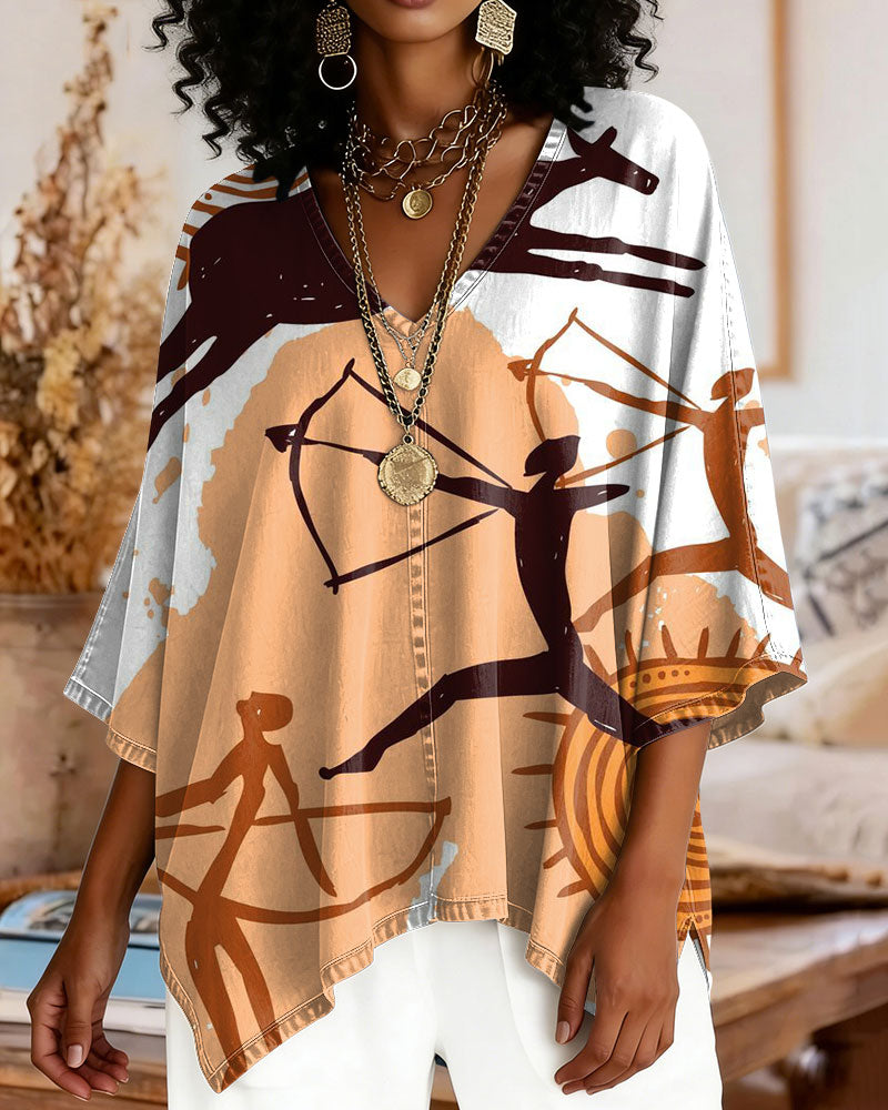 V-neck Loose Black Retro Totems Design Loose-fitting Top