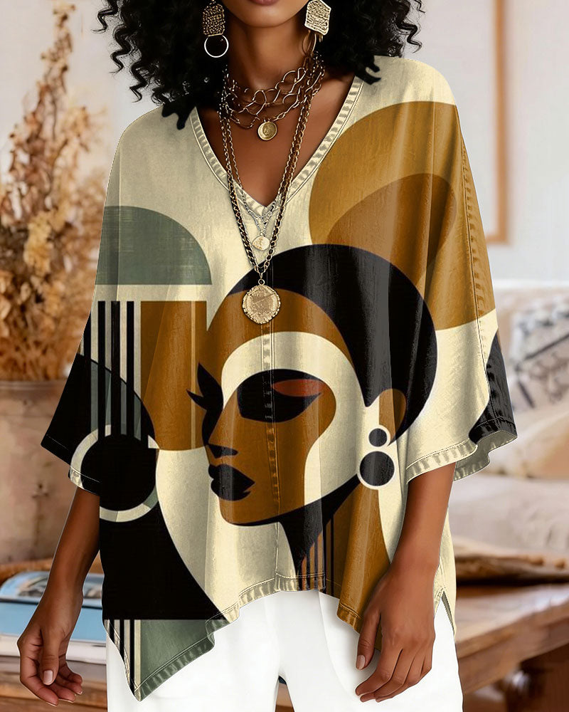 V-neck Loose Abstract Geometric Face Design Loose-fitting Top