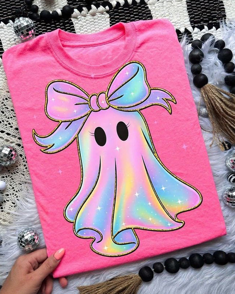 Retro Halloween Pink Denim Ghos Crew Neck Casual Short-Sleeved T-Shirt