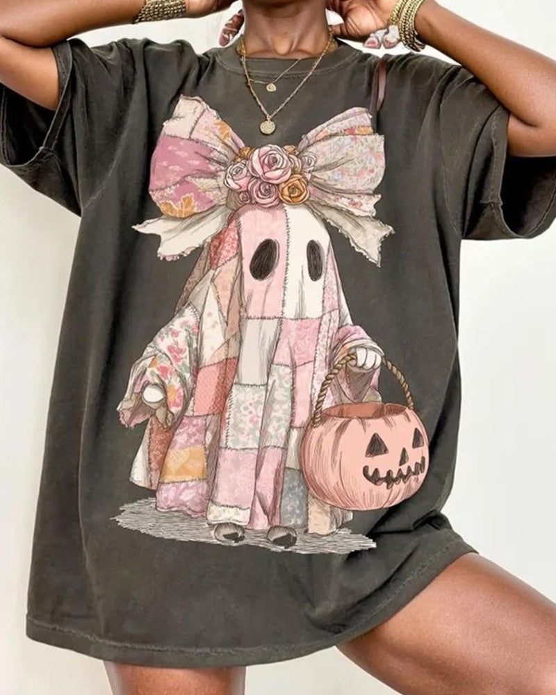Halloween Pumpkin Ghost Bow 100% Cotton Crew Neck Short Sleeve Tshirt