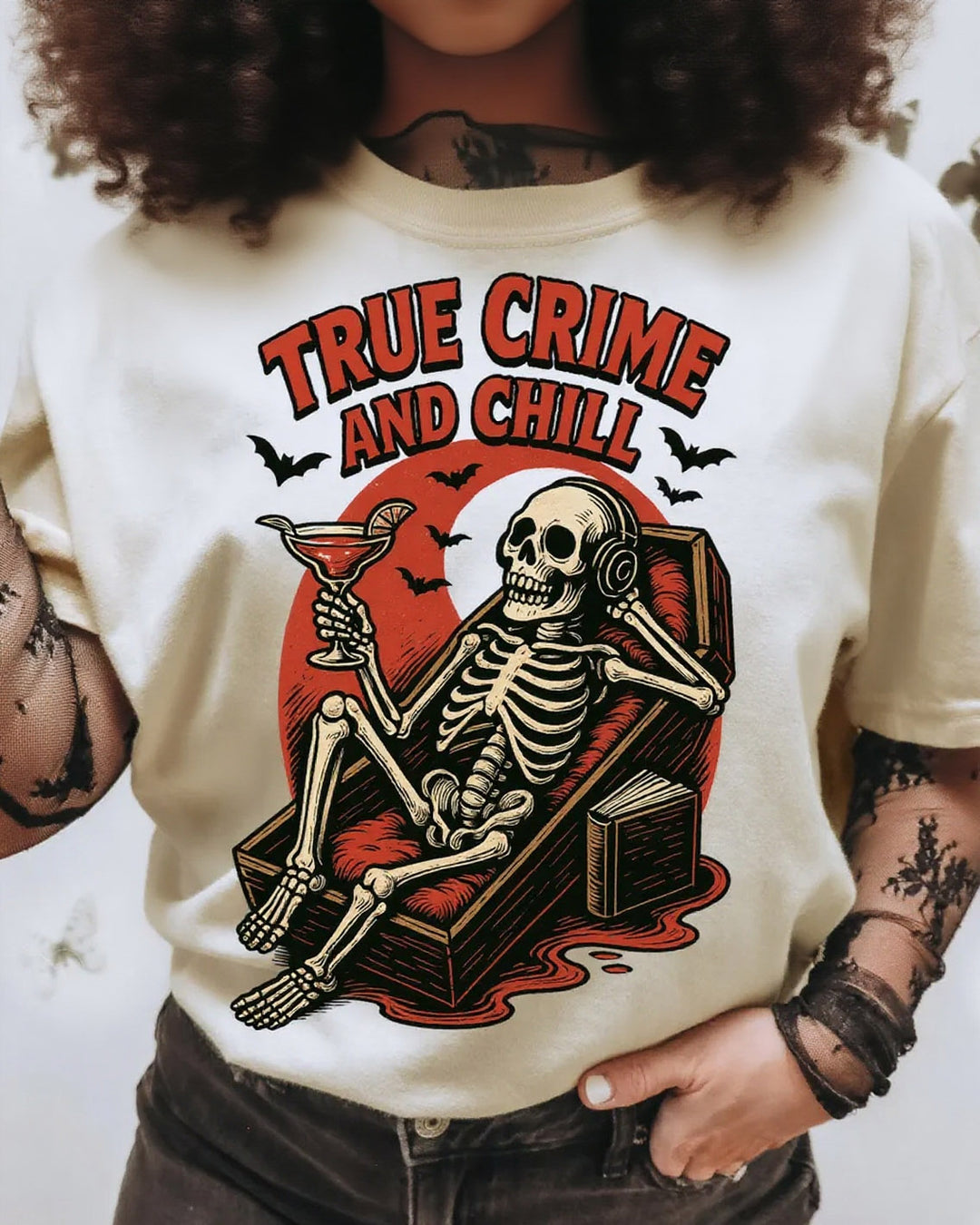 Halloween Crime and Chill Creepy Skeleton 100% Cotton Crew Neck Short Sleeve Tshirt