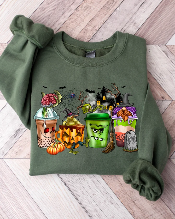 Halloween Gnomes Coffee Cup Cotton Long Sleeve Sweatshirt