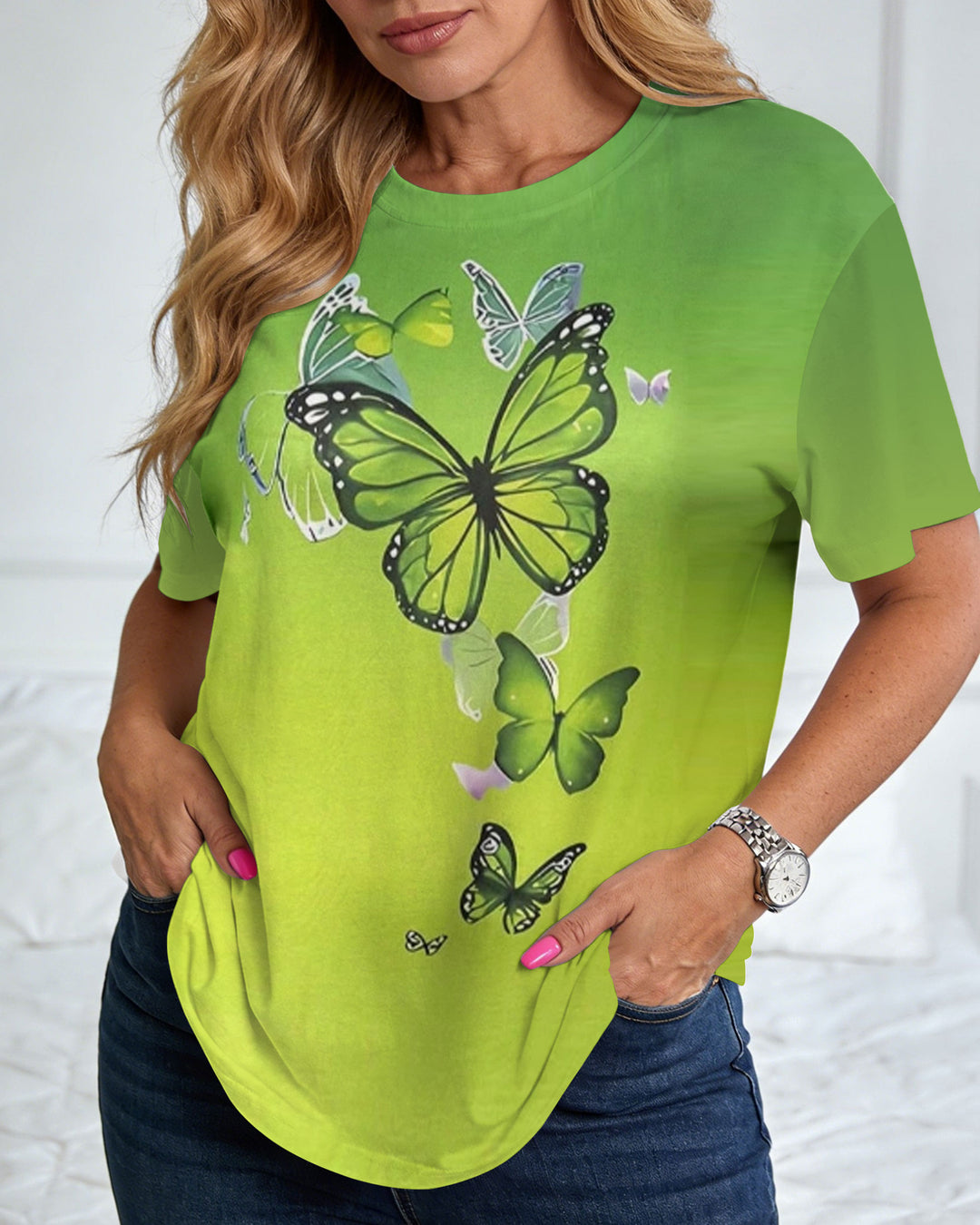 Gradient Color Butterfly-Print Short-Sleeve Tee