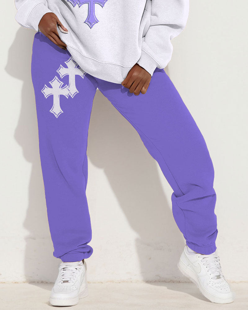 Colorblock Cross Print Long Sleeve Sweatshirt Two Pieces Set