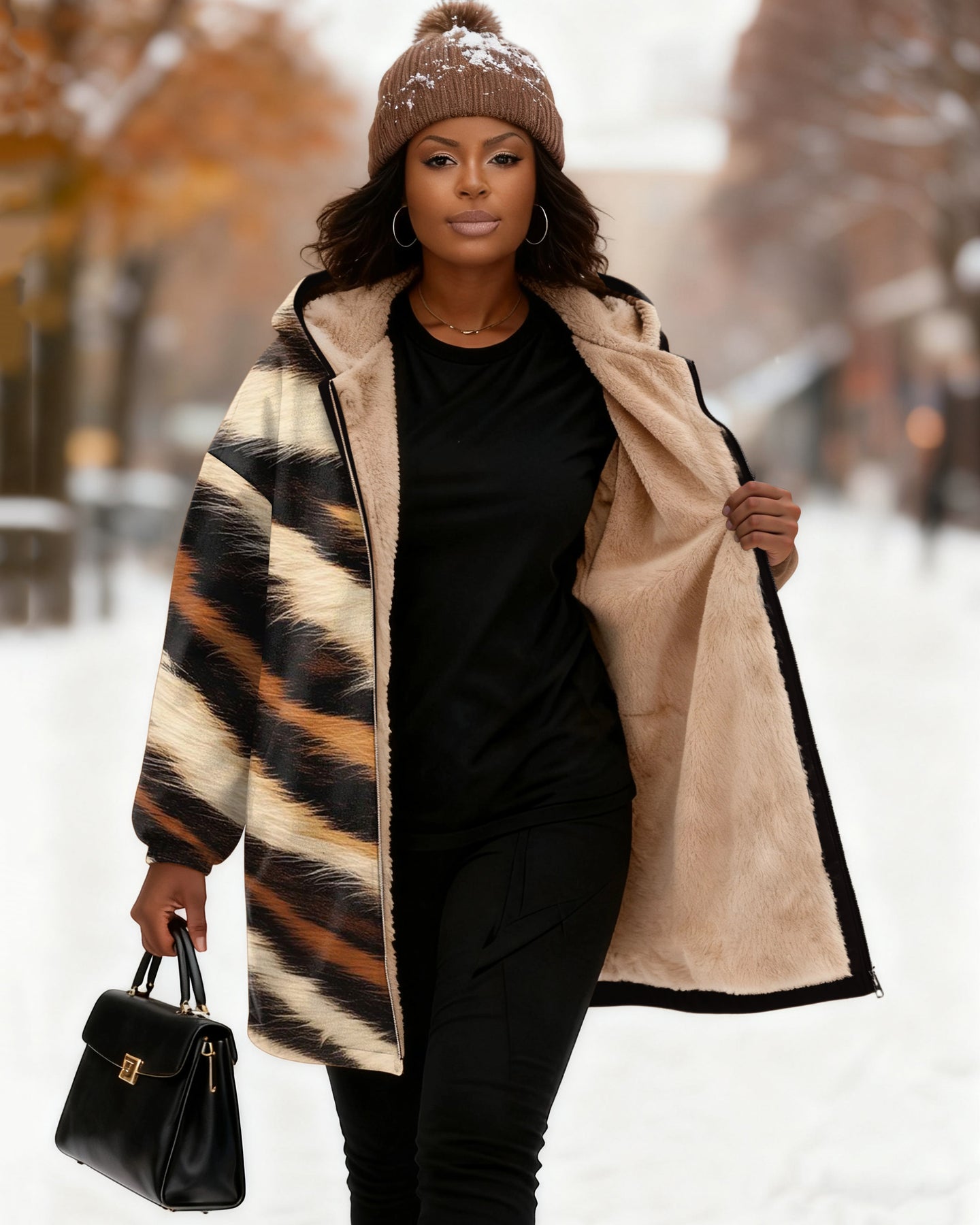 Tiger Print Long Sleeve Zip-Up Fleece Long Hoodies