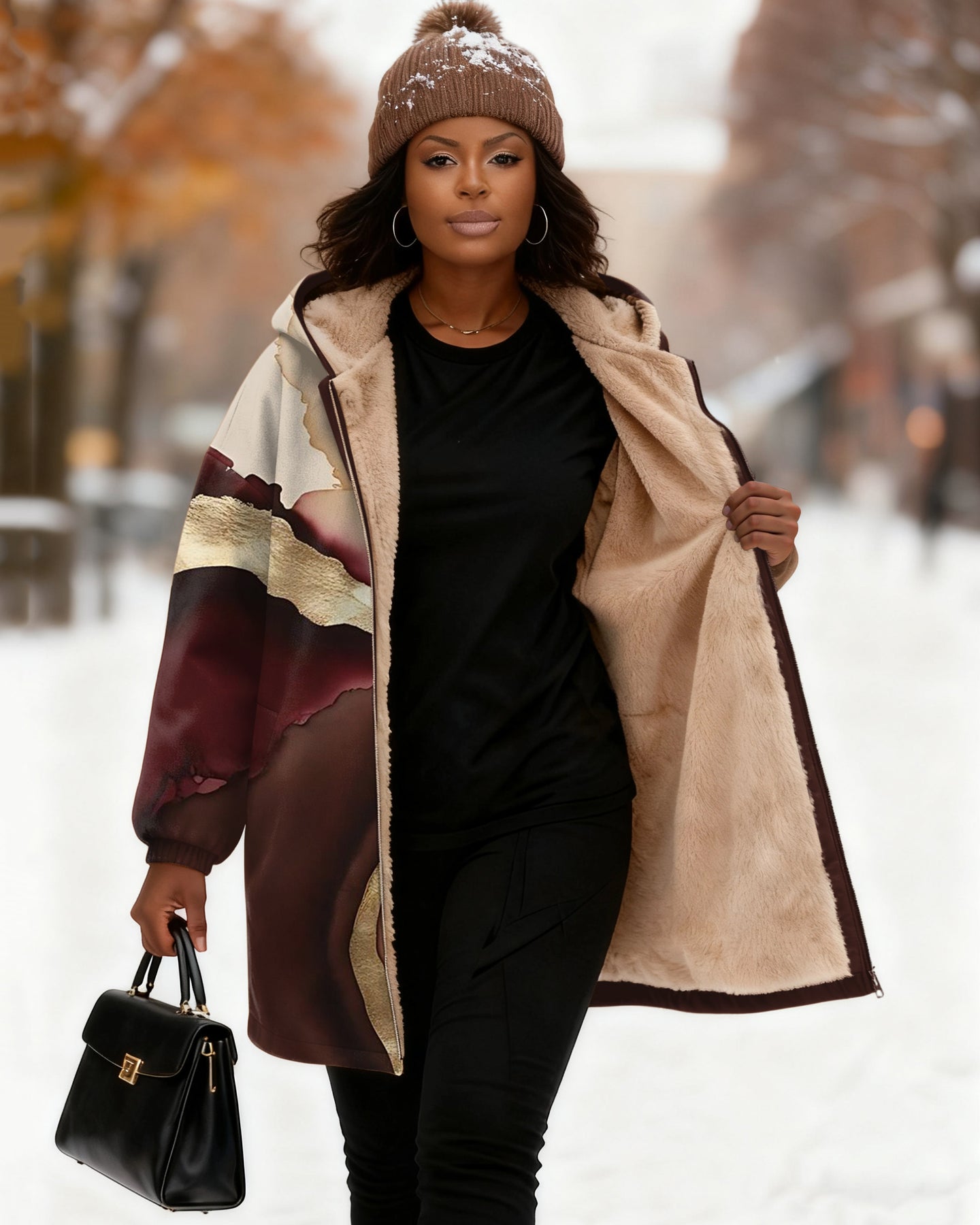 Wave-shaped Color-blocking Texture Long Sleeve Zip-Up Fleece Long Hoodies