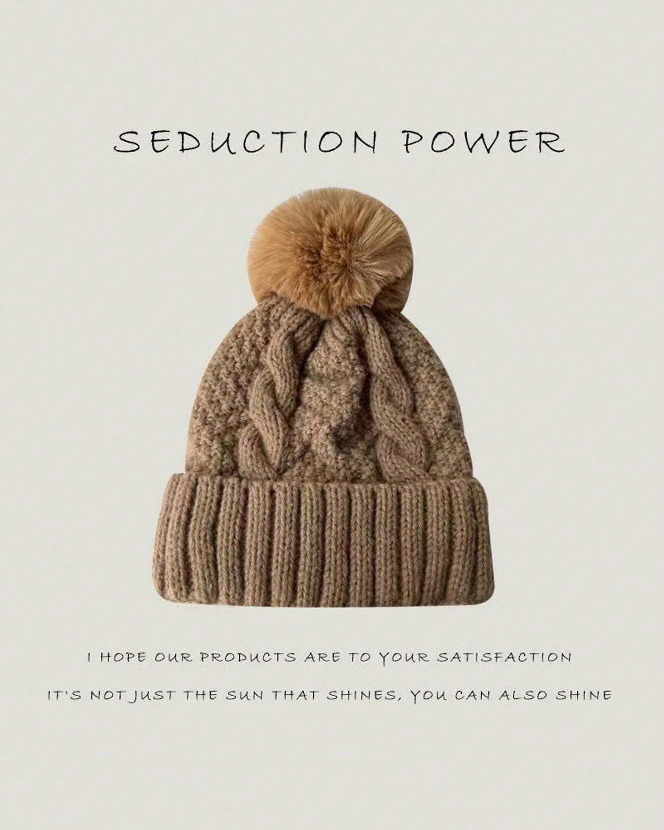 Women Warm Knitted Hat With Large Fur Pom Pom