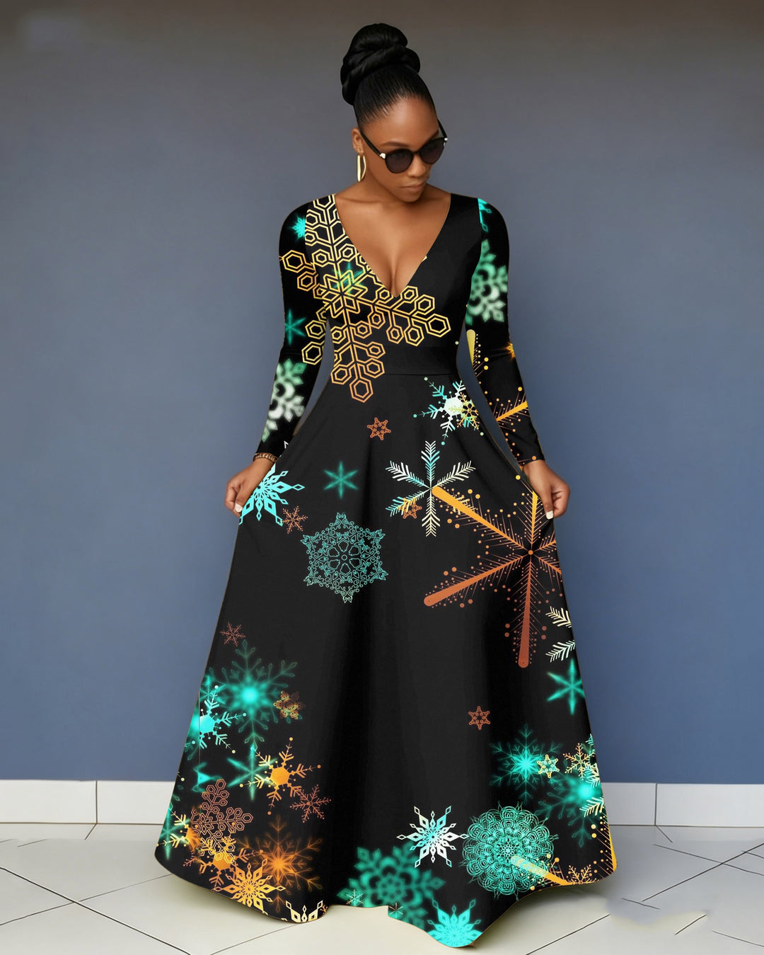 V Neck Christmas Colorful Snowflakes Long Sleeves Maxi Dress